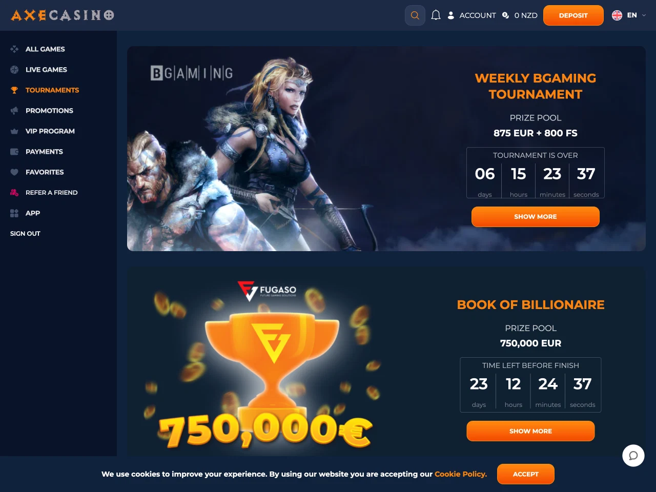 Axe Casino supports over 25 payment methods, including Visa, Mastercard, Bitcoin, Neosurf, and bank transfers. The minimum deposit here is $20, which is a fair minimum deposit. Delays have been reported by some users (though our withdrawal was completed on time). What’s also worth mentioning is that Axe supports NZD transactions, ensuring smooth payments for Kiwi players. However, detailed information about payments is not stated clearly. Therefore, you might need to contact support.