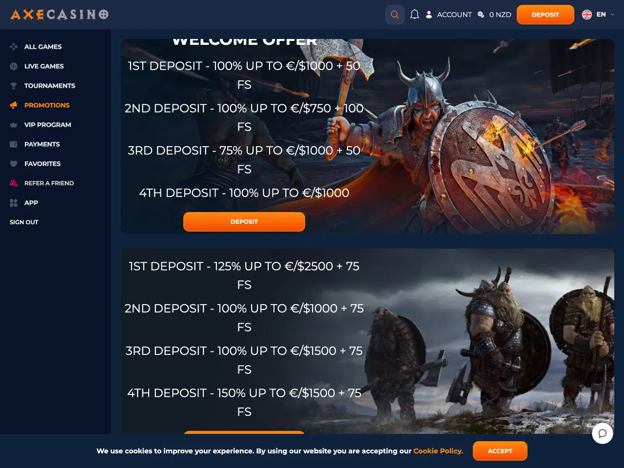 Axe Casino stands out with its Viking-themed design. It features a daily reload bonus, so you can deposit and get your prizes every day, and a referral bonus, where you can invite your friends and receive a cash bonus without any deposits!. The casino supports NZD transactions through over 25 payment methods, including Visa, Mastercard, Payz, Interac, Bitcoin, and others. Withdrawals are generally processed within 1-3 days. During our research, we noticed some reviews from other players about delays in payouts. Yet, after testing this casino on our own, we didn't face the same issue. Customer support is accessible via live chat and email, with responses typically received promptly during operating hours. However, live chat support is not available 24/7, which could be a limitation for players requiring assistance outside of regular hours.
