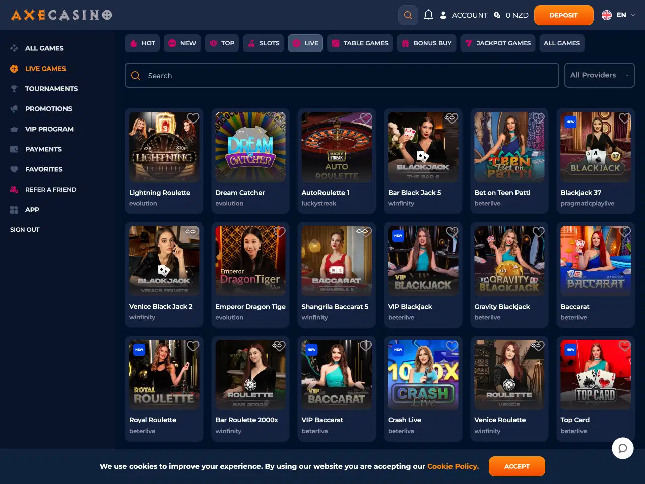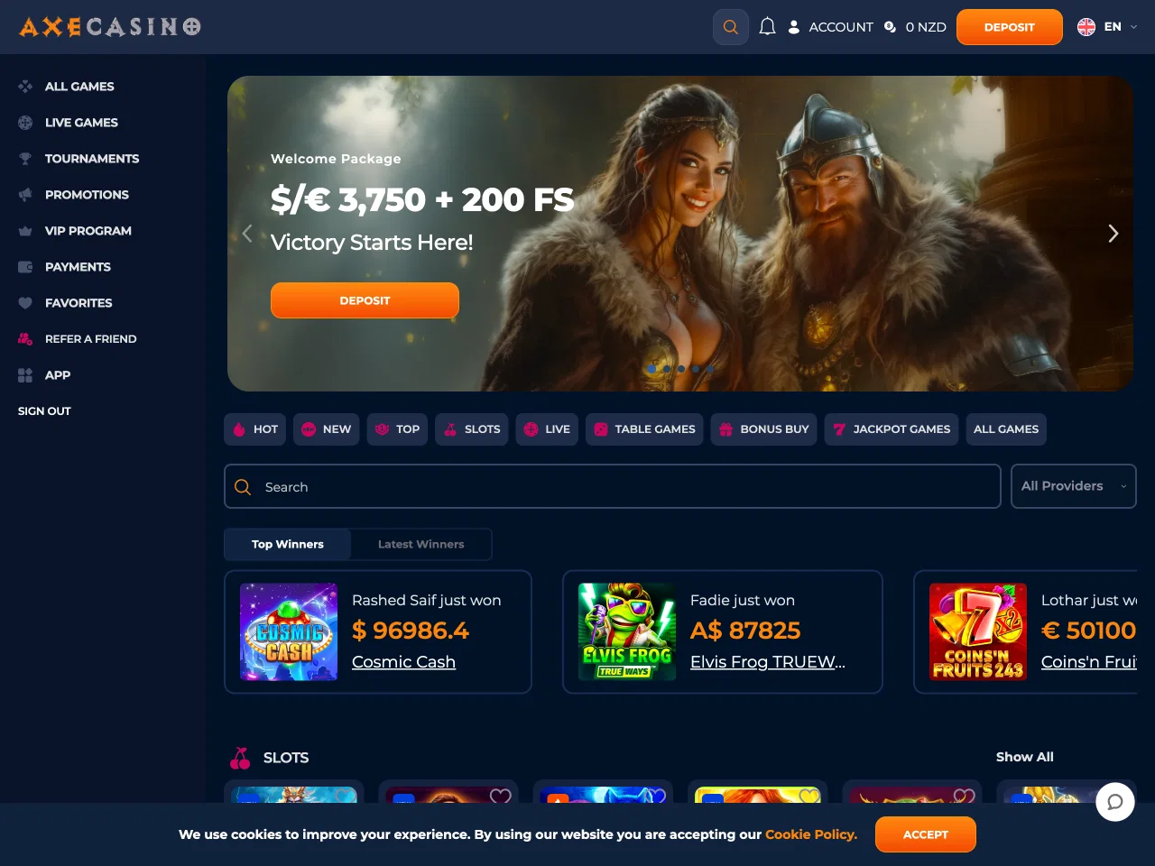 Axe lists a total of around 6,000 games, a number that includes over 300 live dealer titles. Categories range from pokies and table games to scratch cards and video poker. In addition, blackjack, roulette, and baccarat are present in both standard and live formats. On the main page, you can also see the top and the latest winners, which helps build excitement and trust by showing real players hitting big wins in real time. The Top Winners tab highlights the biggest payouts, giving players a glimpse of what’s possible, while the Latest Winners tab shows the most recent lucky spins, creating a sense of activity and encouraging others to try their luck too.
