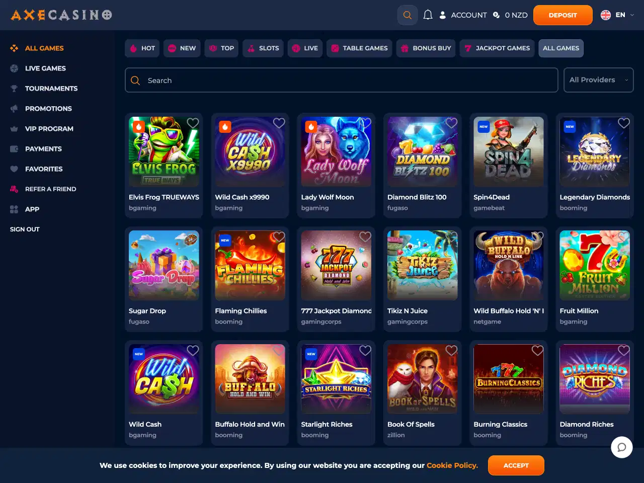 Axe Casino partners with more than 40 software providers, including 1spin4win, 3 Oaks Gaming, 4thePlayer, Amatic, and Apparat. Each provider's titles are listed alphabetically within the lobby. The interface loaded without issue during our testing. Game categories remain consistent regardless of provider, which simplifies browsing and improves the users’ experience.