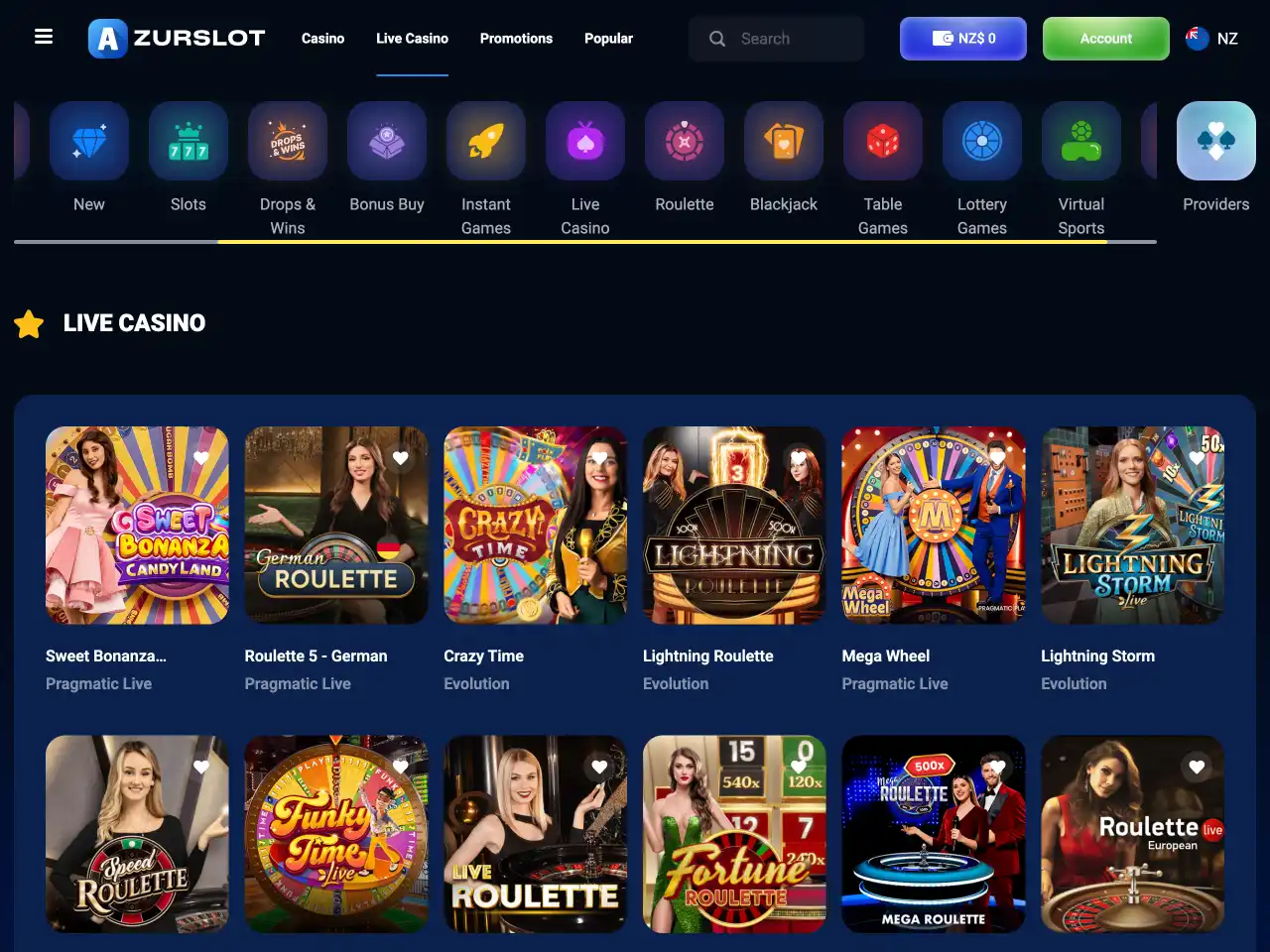 AzurSlot divides its offerings into distinct categories, making navigation straightforward for users seeking specific features. The site includes dedicated sections for Bonus Buys and Drops & Wins, both accessible from the main casino menu. Most slots support demo mode, but not all games function equally across devices. Some mobile optimisation is lacking. Load times vary. Table games include multiple roulette and blackjack variants, as well as baccarat, craps, keno, and others. Live casino coverage is robust, with multiple providers offering live versions of all popular game types.