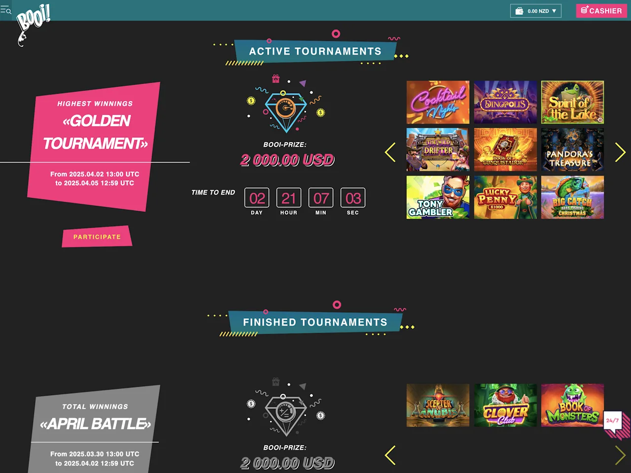 Booi Casino's Tournaments page displays available competitions at the casino with real-time leaderboards. Each event has all the essential details, including prize pools, minimum bets, and countdown timers. Players can monitor their standings and potential winnings promptly. The straightforward layout ensures players can easily navigate through various tournaments, maintaining a dynamic gaming experience.
