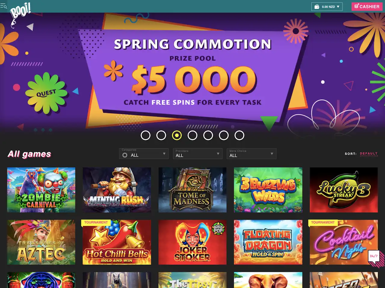 Booi Casino offers an impressive choice of games. Among 10,000 game tiles featured at the casino, players can find over 800 live dealer games, which is an impressive range of live dealer titles that can be found very rarely in other online casinos. Moreover, while offering a welcome bonus of 225% of up to $1,500 and 100 FS, the casino requires a minimum deposit of only $10, making it a great option for those who want to experience the thrill of gambling without significant financial commitment. In addition, at Booi, players can also receive no-deposit promotions, the bonus codes for such promos can appear in players’ accounts or be posted publicly. Besides, the casino’s Tournaments tab deserves your attention as well, as there you can participate in the casino’s quests, complete tasks and receive bonuses and other prizes as a reward. Also, you can take part in competitions with other players to win cash prizes.