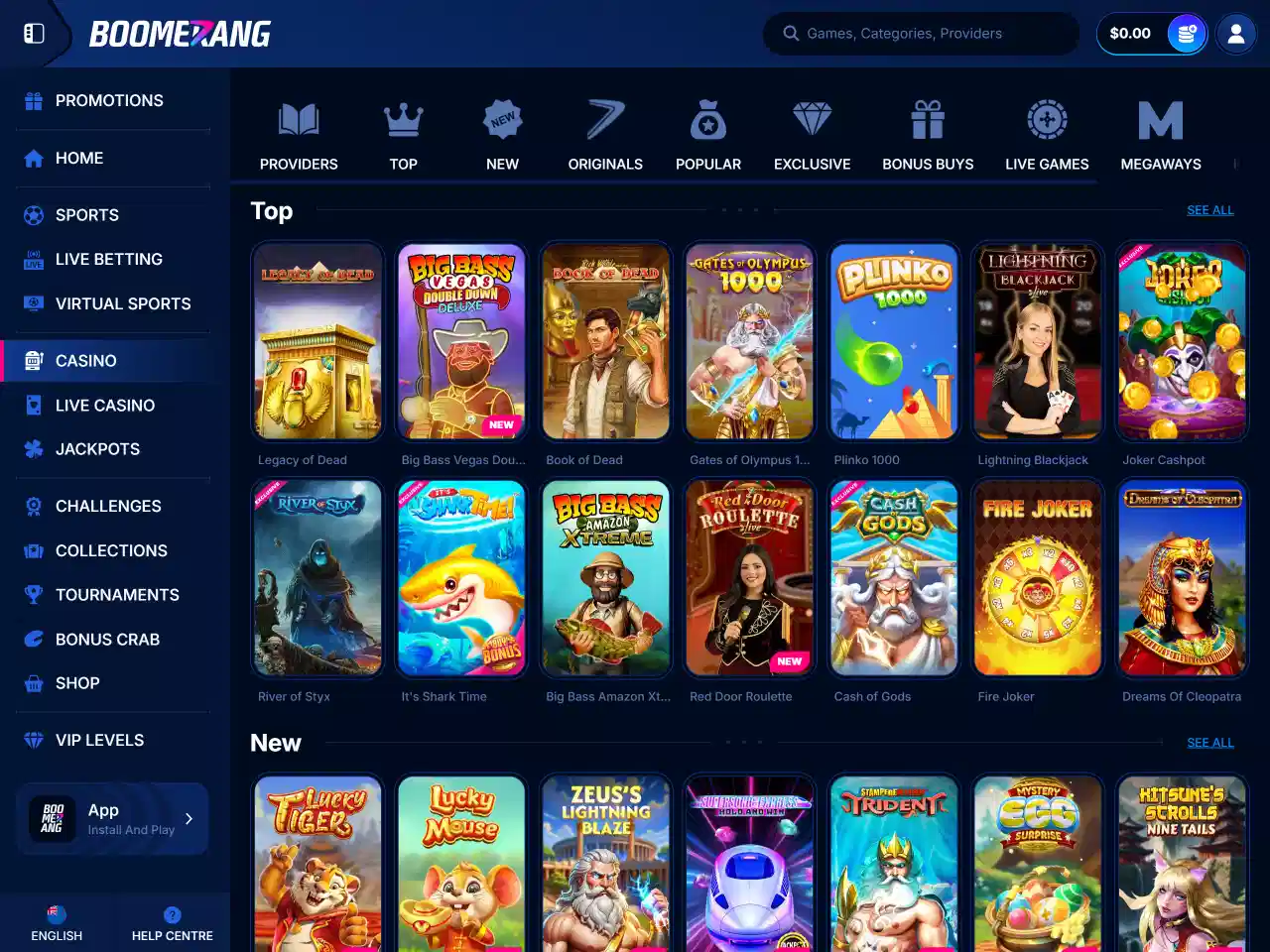 The most popular games at Boomerang Bet are pokies. Often played titles include Aviator, Goldy Piggy, Big Bass Bonanza, and Zeus the Thunderer. These titles appear first in the Top Games tab, suggesting frequent player activity. Live game picks, such as Crazy Time and Mega Roulette, are also highlighted.