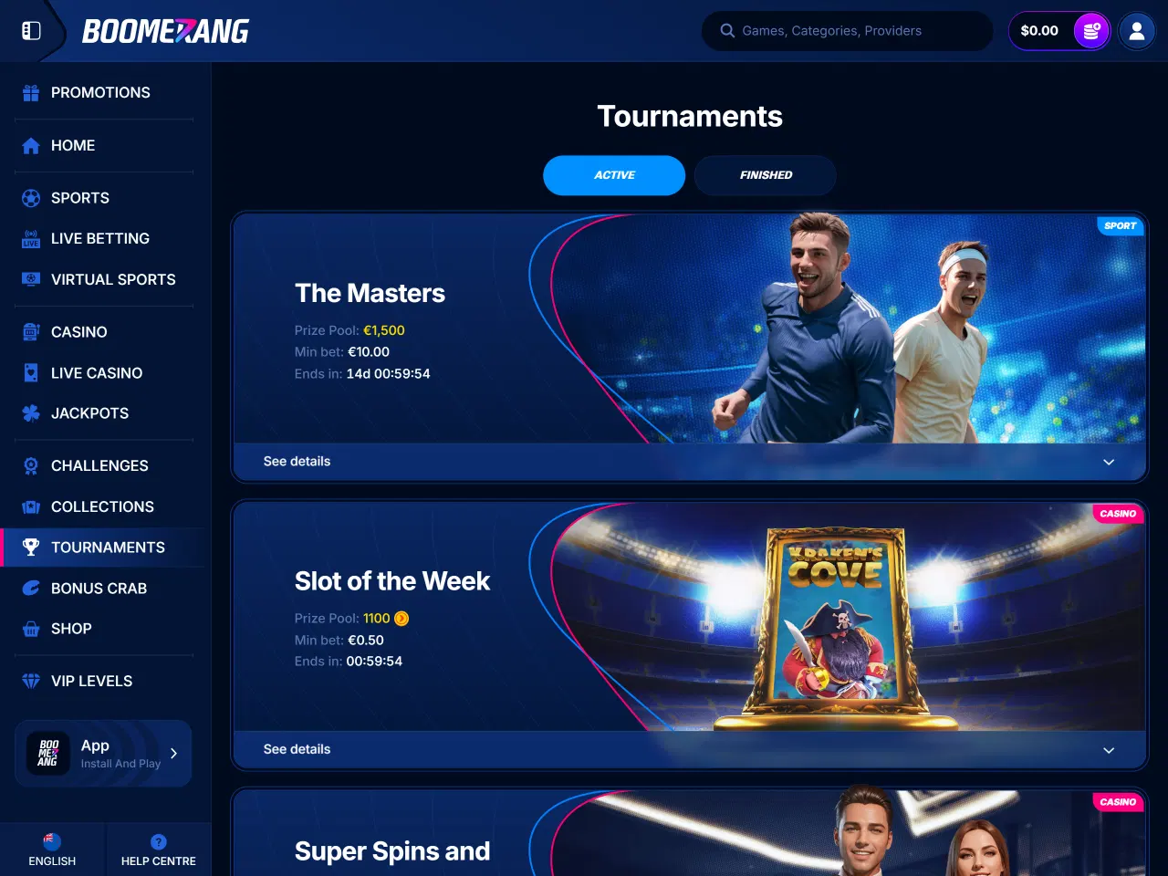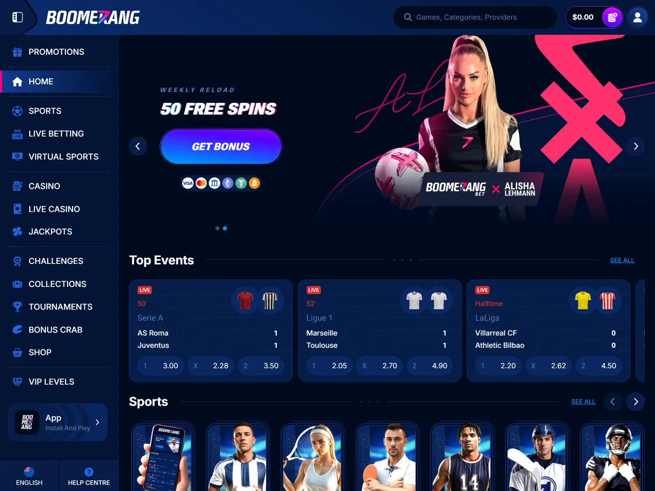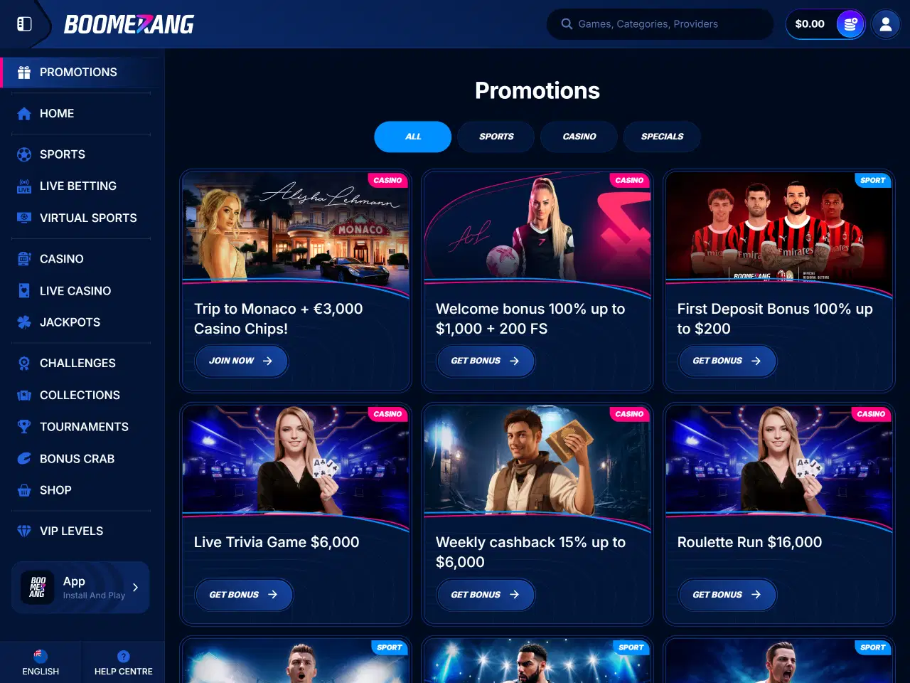 Boomerang Bet offers its users two welcome offers to choose from. One covers casino games, while the other one is for sports betting. Besides that, this casino has weekly reload offers with free spins, cashback, and temporary seasonal offers for casino enthusiasts. For sports betting, there are also cashback offers, weekly reloads with bonus money, enhanced winnings promos, and more. Additionally, you can try your luck at Bonus Crab rounds and win more prizes. Boomerang Bet Casino also provides players with an accessible Bonus Shop, where they can exchange casino coins for free bets, bonus money, free spins, and Bonus Crab credits. To earn coins, you need to complete Challenges, participate in Tournaments, deposit, and place bets. For each ~$200 wagered, you will receive one coin, as well as 5% of every deposit goes to your coin balance. The casino doesn’t have any no-deposit or no-wagering promotions at the moment.