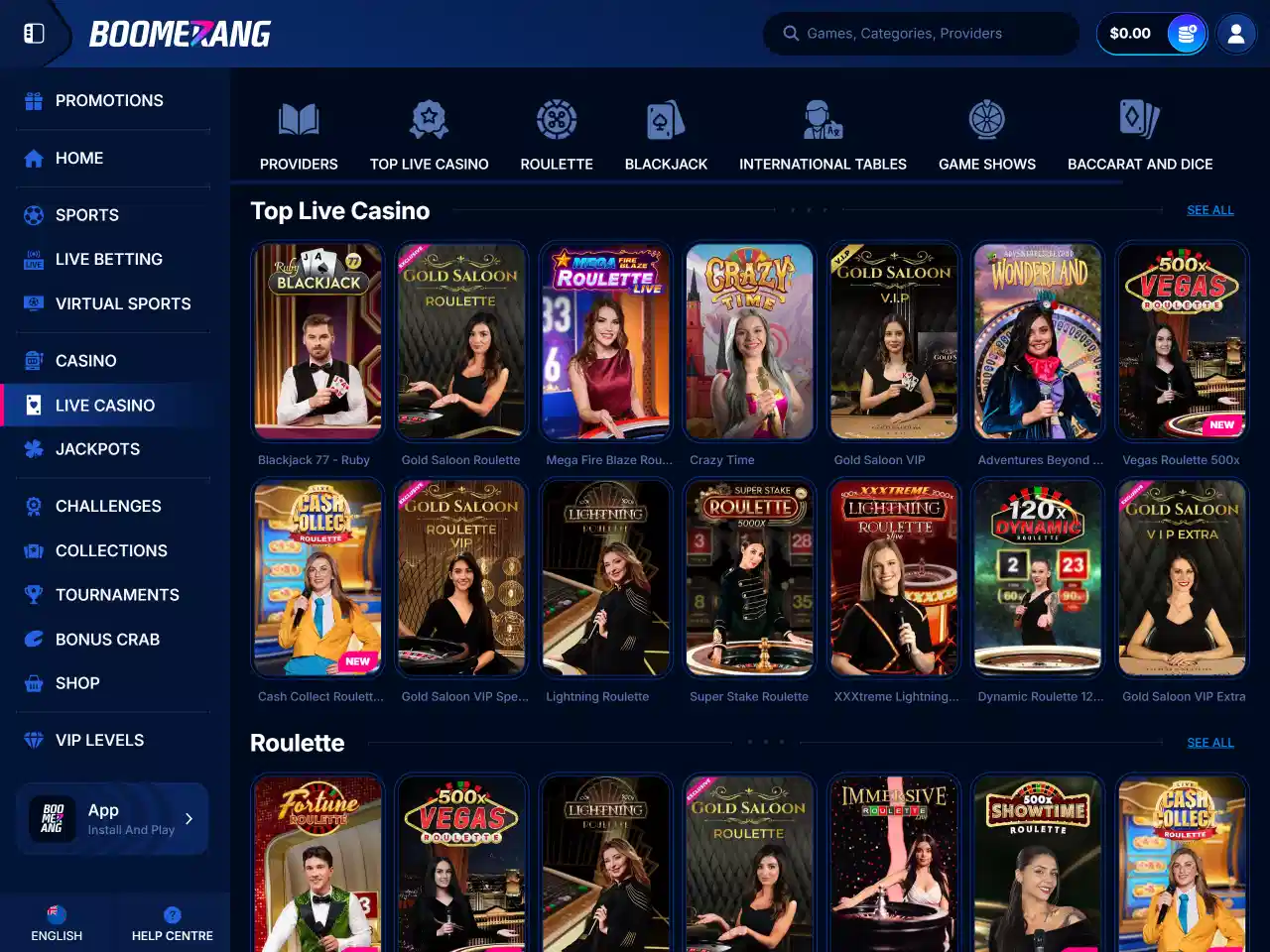 Boomerang Bet offers a good collection of games, including pokies, table options, live dealer titles, and jackpots. Each category consists of numerous titles as, for example, the Live Casino has more than 100 titles, featuring poker, baccarat, dice, blackjack, roulette, game shows, and interesting options like Lightning Roulette and Crazy Time. The website offers an Exclusive section, which includes custom titles such as Zeus Divine Multipliers and Goldy Ox. In addition to that, there are categories, such as Originals, Bonus Buys, Megaways, and Instant Games. To enhance players’ experience even more, Boomerang Bet Casino holds a Live Trivia Game twice per week — every Tuesday and Thursday. This game doesn’t require a minimum deposit and allows players to win up to $6,000 for answering True or False questions correctly. So, this gambling platform covers the most popular genres. Is this enough for demanding players seeking variety and quality? Boomerang Bet’s offering is substantial, especially in the live gaming category.