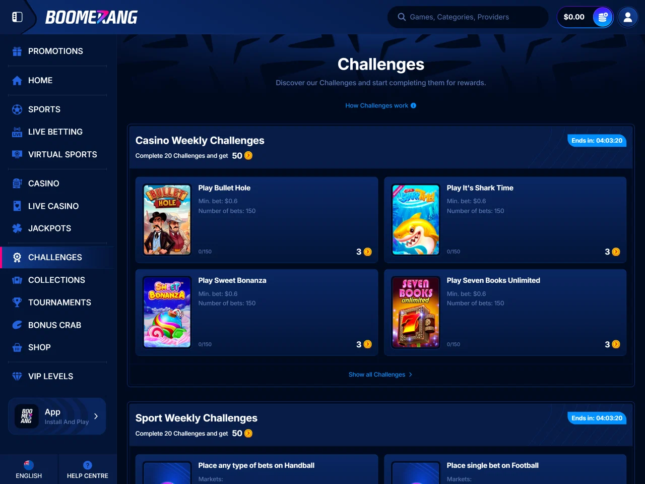 Boomerang Bet attracts players with its selection of 5,000+ game titles from more than 80 software providers. They include 100+ live dealer titles, a Live Trivia Game every Tuesday and Thursday, and exclusive titles specially developed for Boomerang Bet Casino. In addition to that, players can complete daily challenges and try their luck at Bonus Crab rounds to catch casino coins and other surprise rewards. Accumulated points can be spent in the Bonus Shop on additional free spins, bets, and bonus money, as well as Bonus Crab credits.