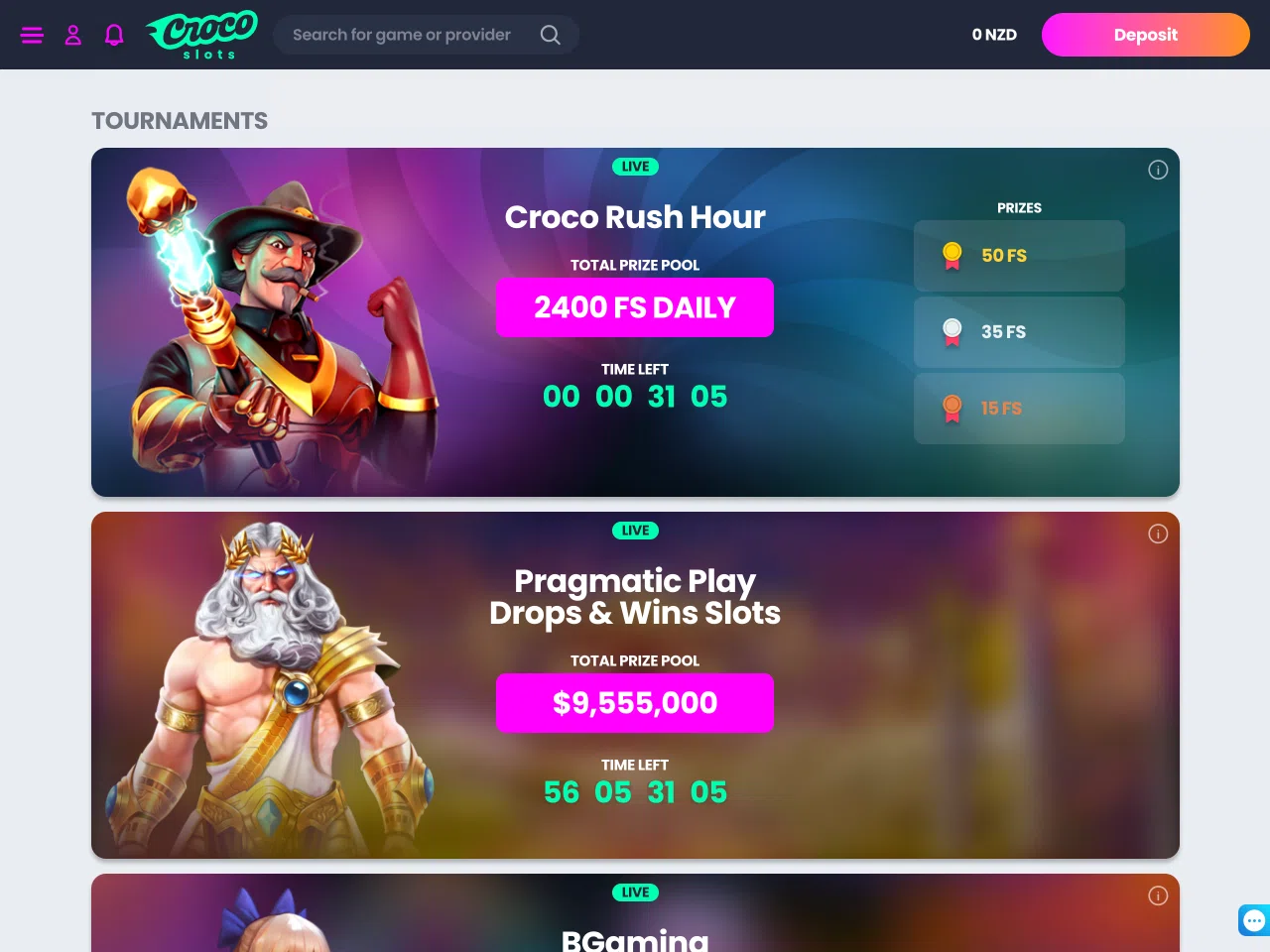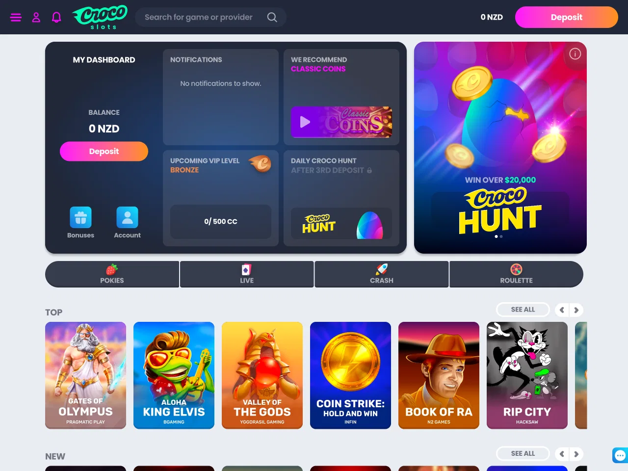 CrocoSlots Casino offers a focused experience for New Zealand players, built around daily rewards, live games, and regular competitions. One of its standout features is the Croco Hunt, a promotion that unlocks prize tiers based on how often you deposit, with a maximum prize being $15,000. Players can also get daily cashback on their losses, which increases the more days they qualify in a row. The live casino section is one of the biggest around, with over 500 dealer-hosted games available anytime. Regular tournaments like Croco Rush Hour give players another way to get involved, while the four-level VIP program adds structure and extra perks for dedicated users.