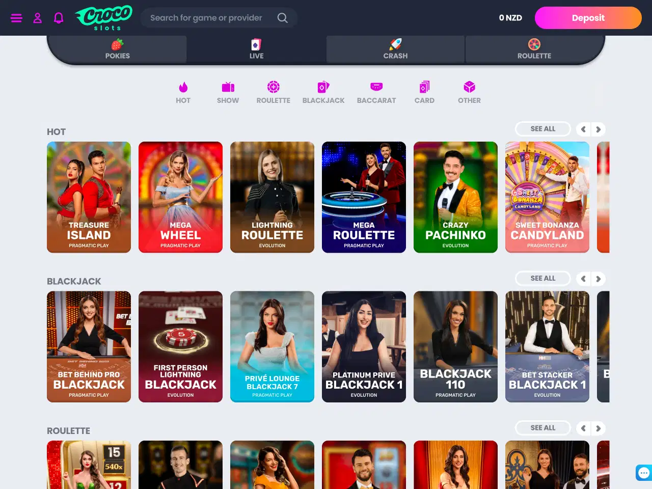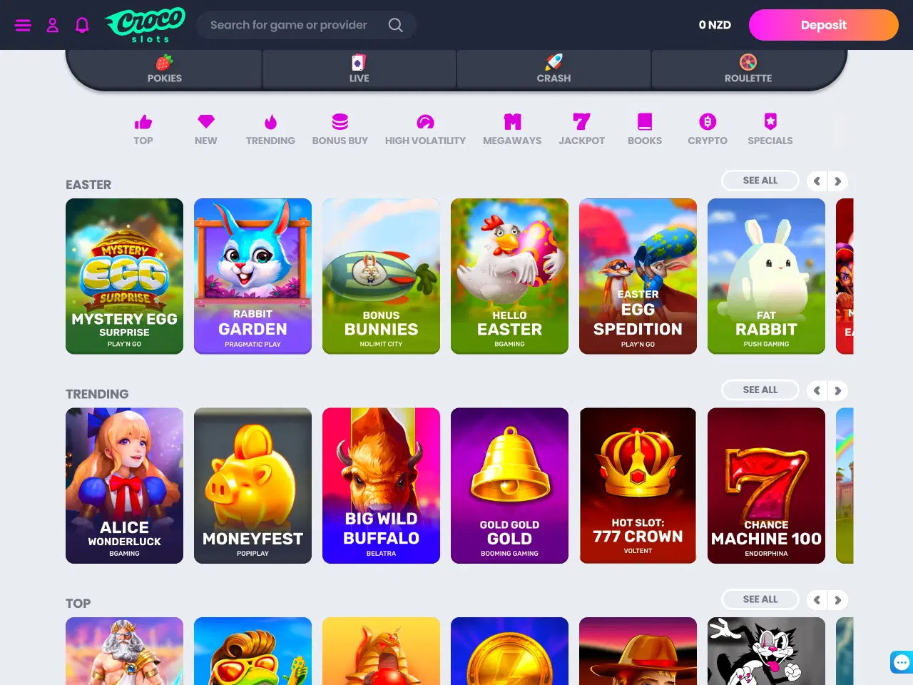 CrocoSlots works with over 90 gaming providers. Titles from NetEnt, Nolimit City, Microgaming, BGaming, and Hacksaw are available throughout the lobby. Punters will find no shortage of pokies—classic and modern—alongside categories for crash, bonus buy, and jackpots. There are even a few for a cheeky flutter when you’re feeling lucky. Filtering tools exist but aren’t precise, and can sometimes make game searches slower rather than faster.