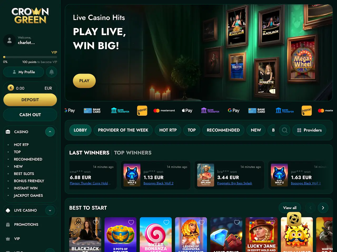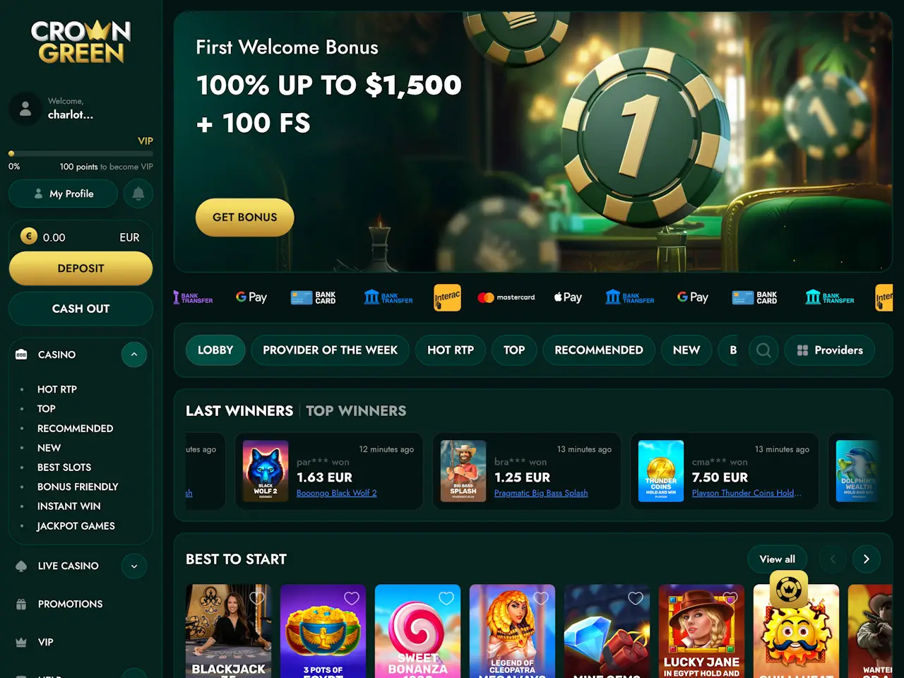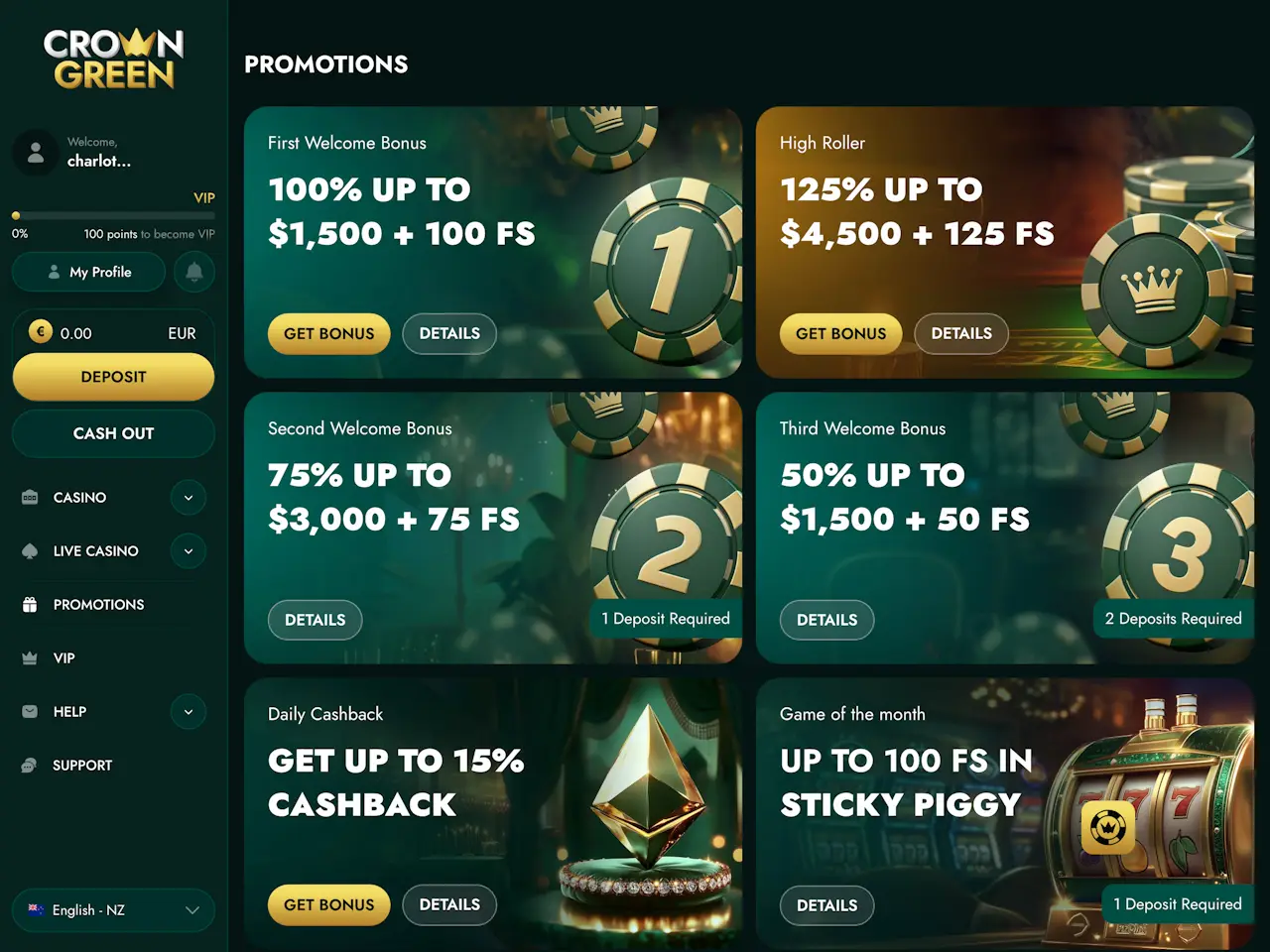 CrownGreen Casino leans into a luxury-style theme, with crown-led branding, dark green and gold visuals, and a VIP Club that unlocks more benefits as you move up through the levels towards Crown Reserve.