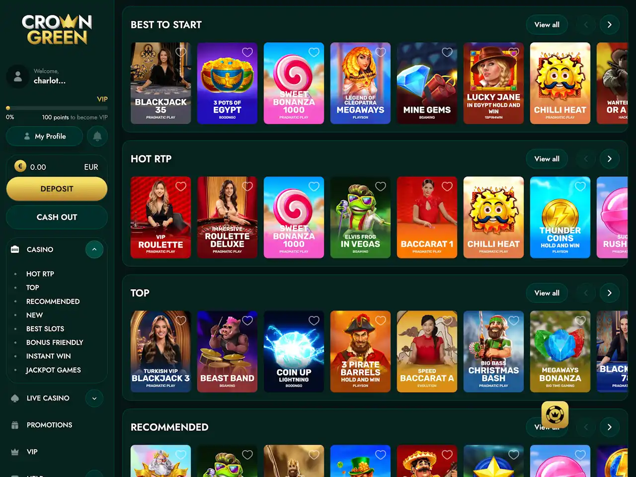 CrownGreen Casino covers all the major game genres — pokies, roulette, blackjack, video poker, bingo, baccarat, craps, keno, scratch cards, and more. All games are well-organised in the lobby, with sections like Hot RTP, Best Slots, Bonus Friendly, Instant Win, and Jackpot Games, making it easy to find what you want.