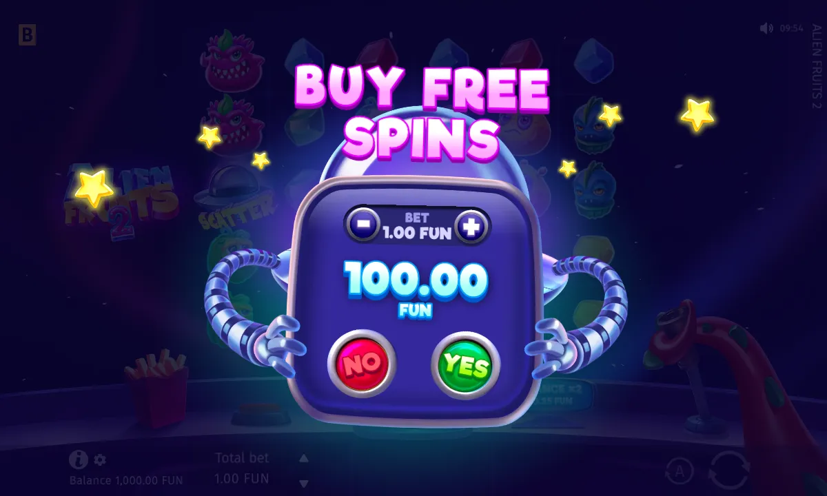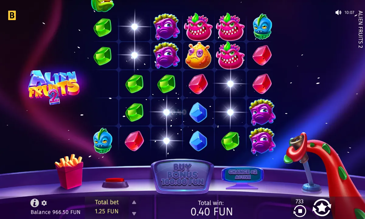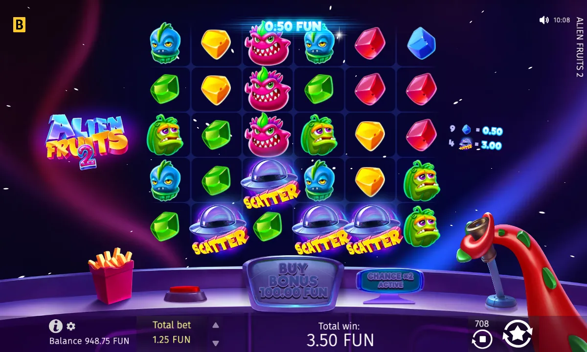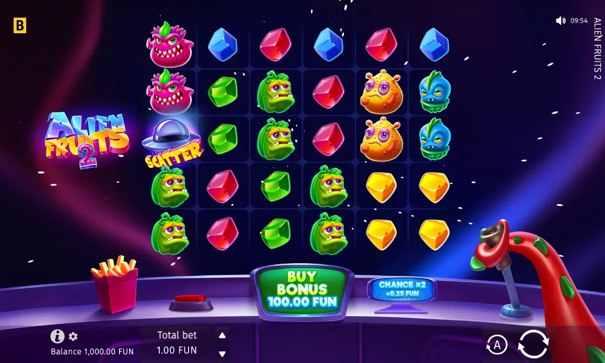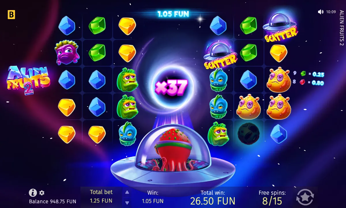The reels are occupied by quirky Alien Fruits with coloured Gems. Your win will be defined by the total number of symbols of one kind. Among them, look out for other flying saucers — those act as Scatters. If you hit more than four, you trigger 15 Free Spins, and you can earn an extra 5 Free Spins by landing 3+ more Scatters during your Free Spins.