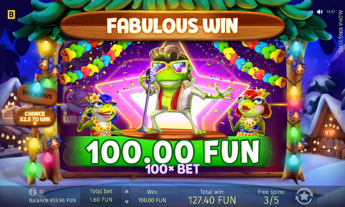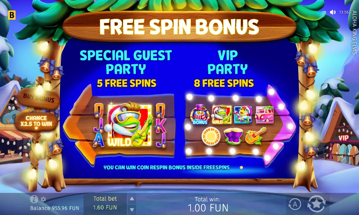 Aloha King Elvis looks like a chill holiday slot, a feature-packed sequel that swaps Vegas lights for Hawaiian vibes without losing its rock’n’roll edge. It delivers a cruisy experience. With medium-high volatility, flexible betting, Buy Bonus options, and two distinct Free Spins modes, the slot offers enjoyable gameplay. Along with Coin Respin jackpots, vibrant visuals, and dynamic music, Aloha King Elvis is best suited for players who enjoy chasing features and don’t mind waiting for bigger wins. We reckon the festive vibes and playful theme make it genuinely fun to spin.