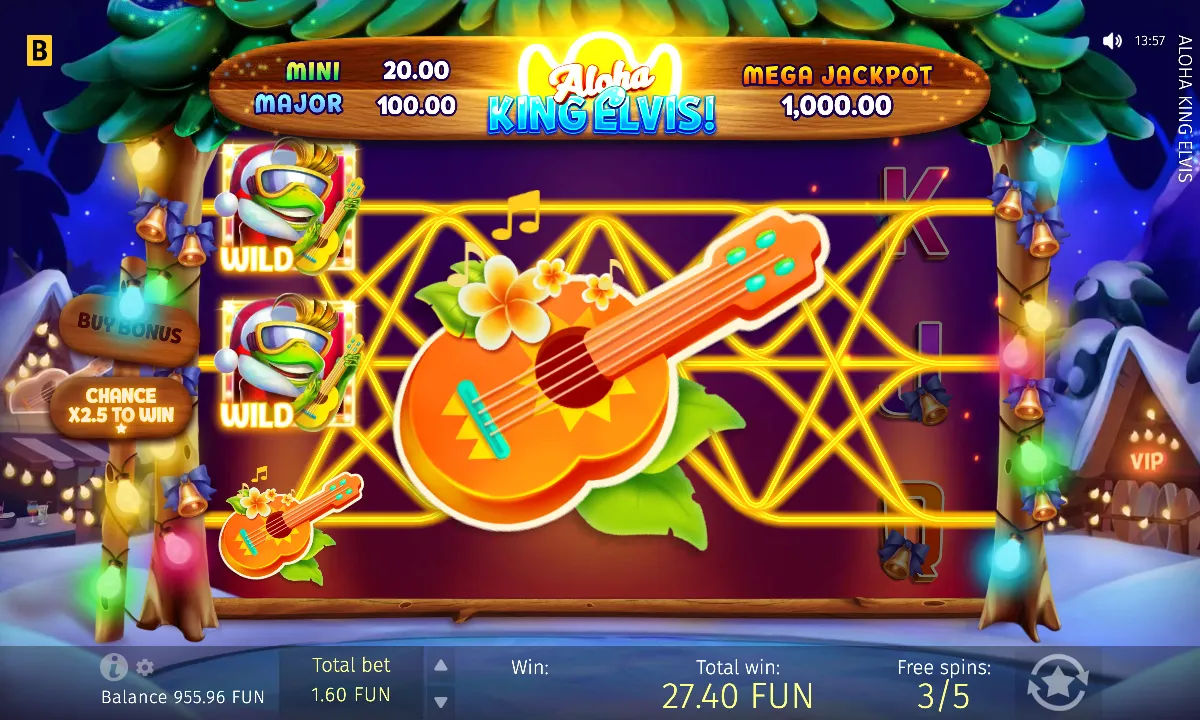 At the time of testing, we played Aloha King Elvis: X-mas Edition. The developers adapted the slot’s skin to create a festive holiday vibe, which is cool. On the other hand, snow and Hawaii don’t usually go together, do they? Seeing snow on palm trees feels a bit odd, but overall, the theme is still quite charming.