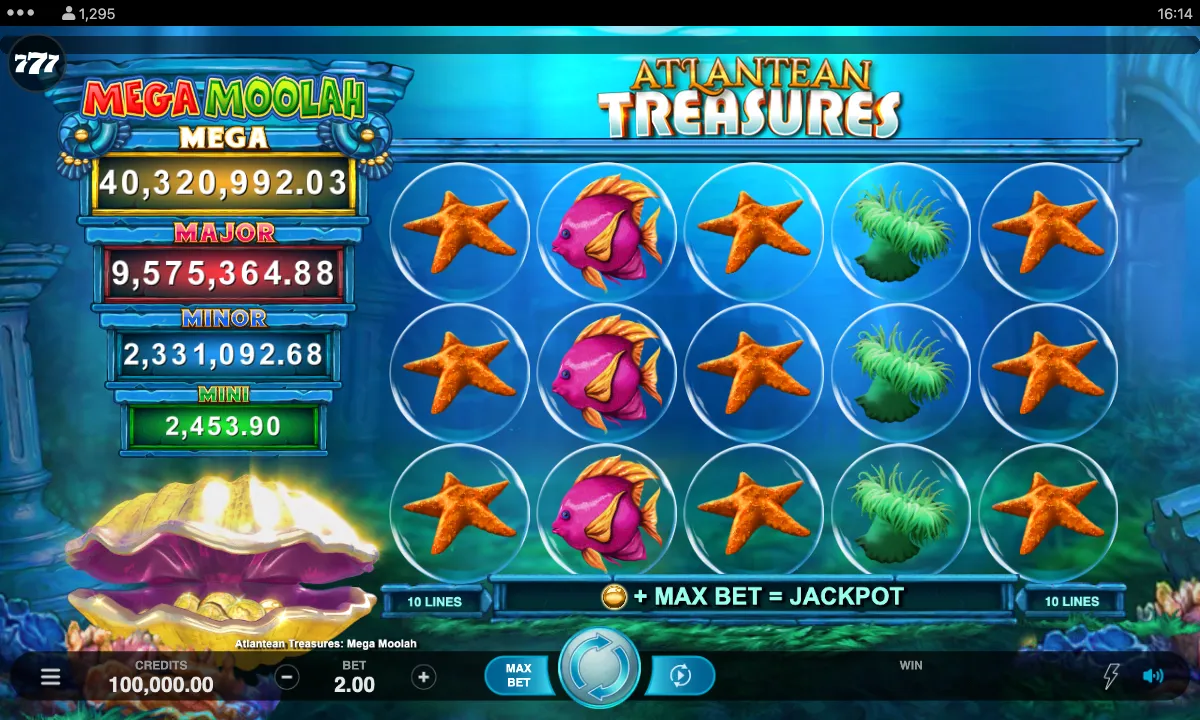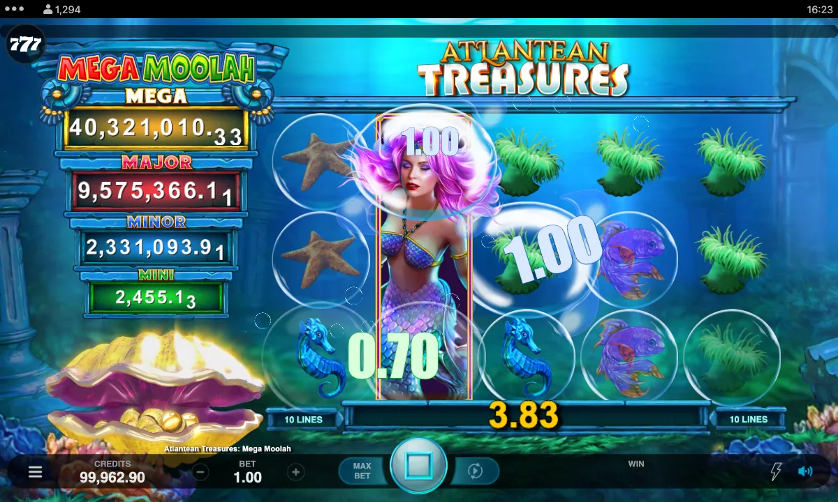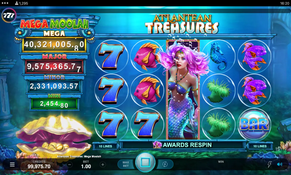 Unlike Mega Moolah, Atlantean Treasures Mega Moolah doesn’t have Free Spins. That said, this pokie has Respins. You’re awarded a Respin for landing an Expanding Wild mermaid. Overall, you can earn up to three consecutive respins if more mermaids appear. Speaking of Wilds, they substitute all symbols, except Progressive Triggers, helping to form more winning combinations. By the way, it’s a 3x5 pokie with just 10 paylines that pay both ways.