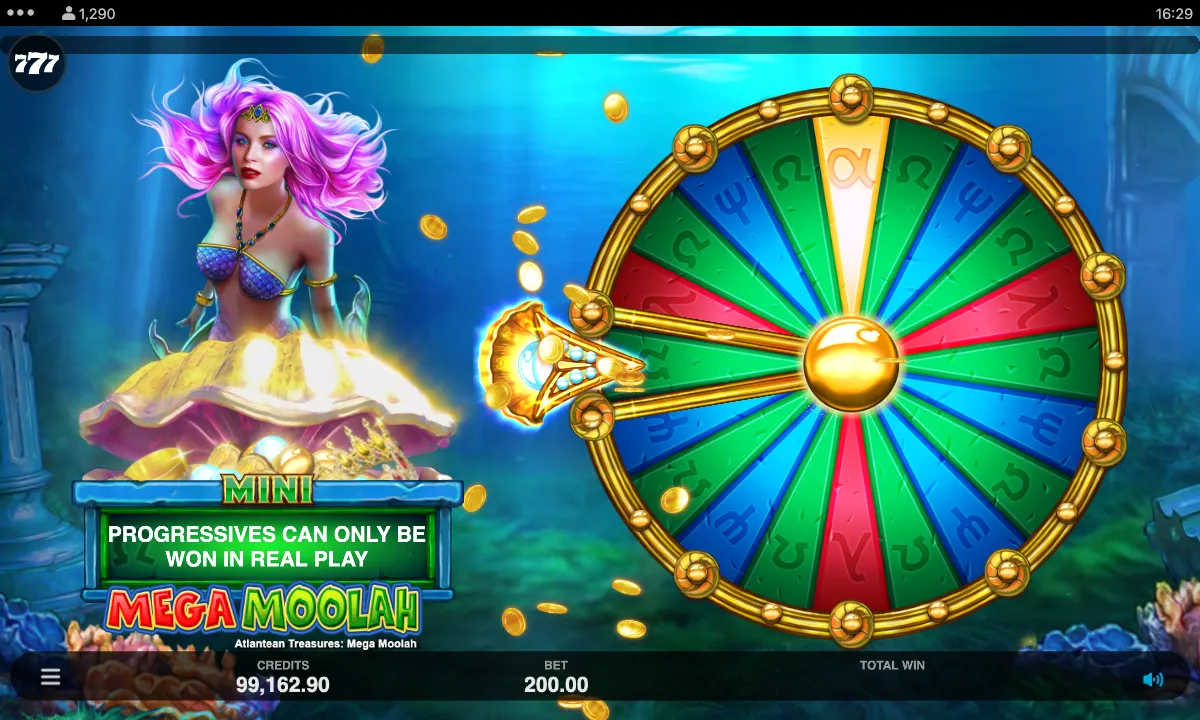 So how do you get the chance to at least try hitting a jackpot? Collect golden pearls (Progressive Triggers) to trigger the Progressive Wheel. They randomly appear over any symbol except Wilds, but landing one doesn’t guarantee you a chance at a jackpot. The only way it can work out is if you collect a Progressive Trigger during a spin at a maximum bet. And yes, this is how we actually triggered Progressive Wheel, as it was faster than collecting enough pearls. Well, we spun that colourful Wheel hoping for the best, of course. Mega jackpot’s value at that moment exceeded $20 million and kept growing. So did the tension in the air. Luck smiled at us, but not quite broadly enough, and we hit the mini jackpot. Wish you better luck with Progressive Wheel if you decide to try Atlantean Treasures Mega Moolah! A small tip: the game rules say that the bigger you bet, the higher your chance of triggering the Wheel. Hopefully, that will help.