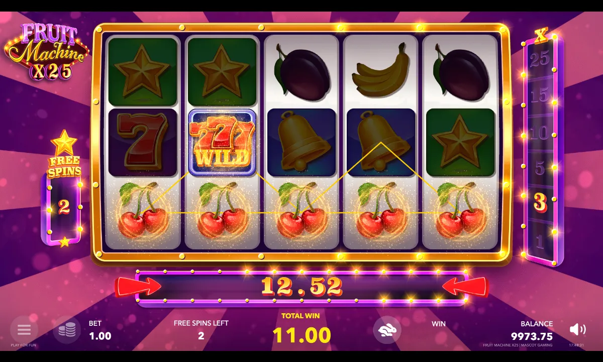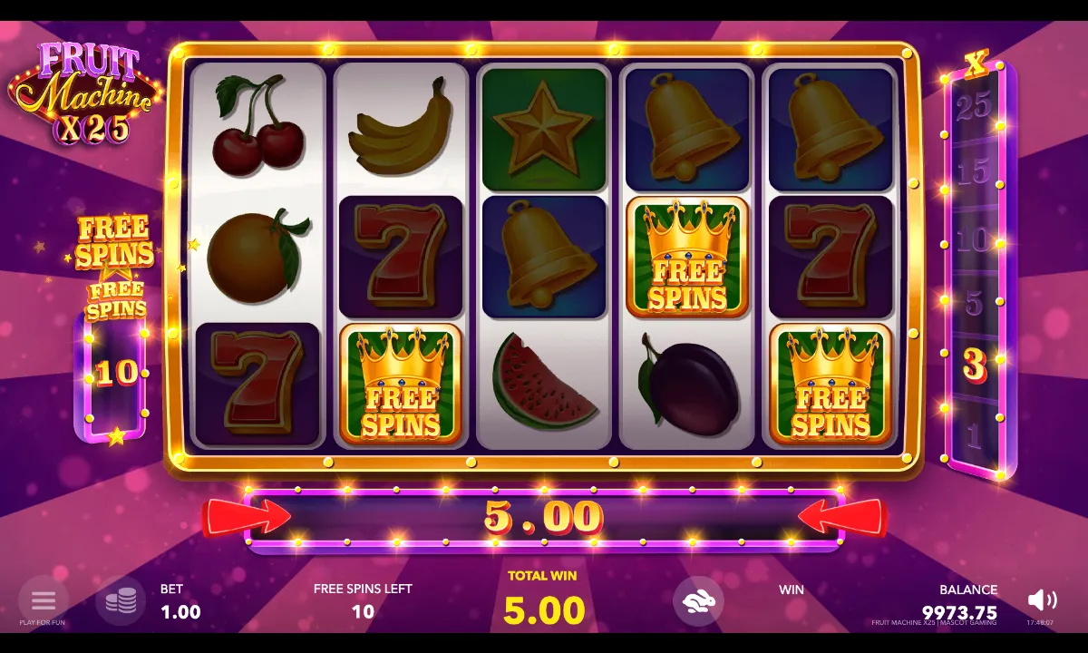 Speaking of, you earn 10, 12, and 15 Free Spins by landing 3, 4, and 5 Scatters, respectively. Besides, Scatters give you payouts, starting at just 2 symbols landed. It’s during Free Spins that the core feature of Fruit Machine x25 manifests itself, awarding random multipliers from 3x to 25x.