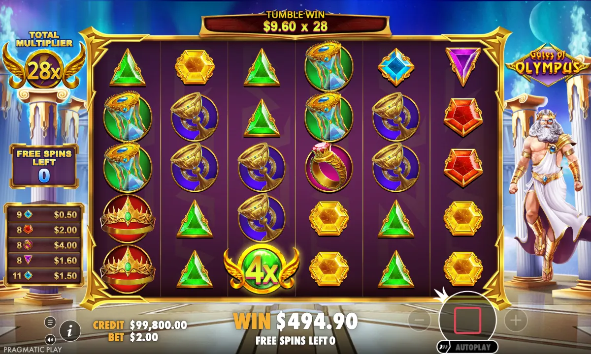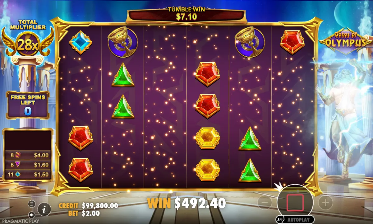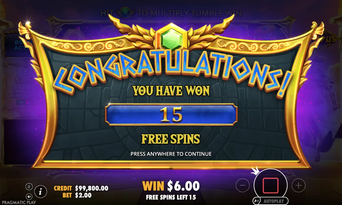 Be ready to place bets ranging from $0.20 to $125.00 and watch the wins cascade at the will of the gods — or, more practically speaking, thanks to the Tumble feature. When the values of multipliers are added to the total win, new symbols continue tumbling onto the reels until no paying combinations remain. And since wins aren’t tied to paylines and symbols can pay anywhere on the screen, a single round can last a while, stack multiple multipliers of up to 500x, and deliver an impressive total win.