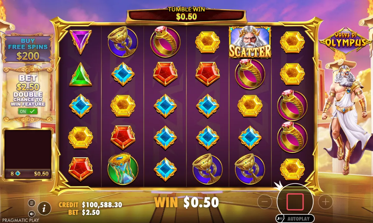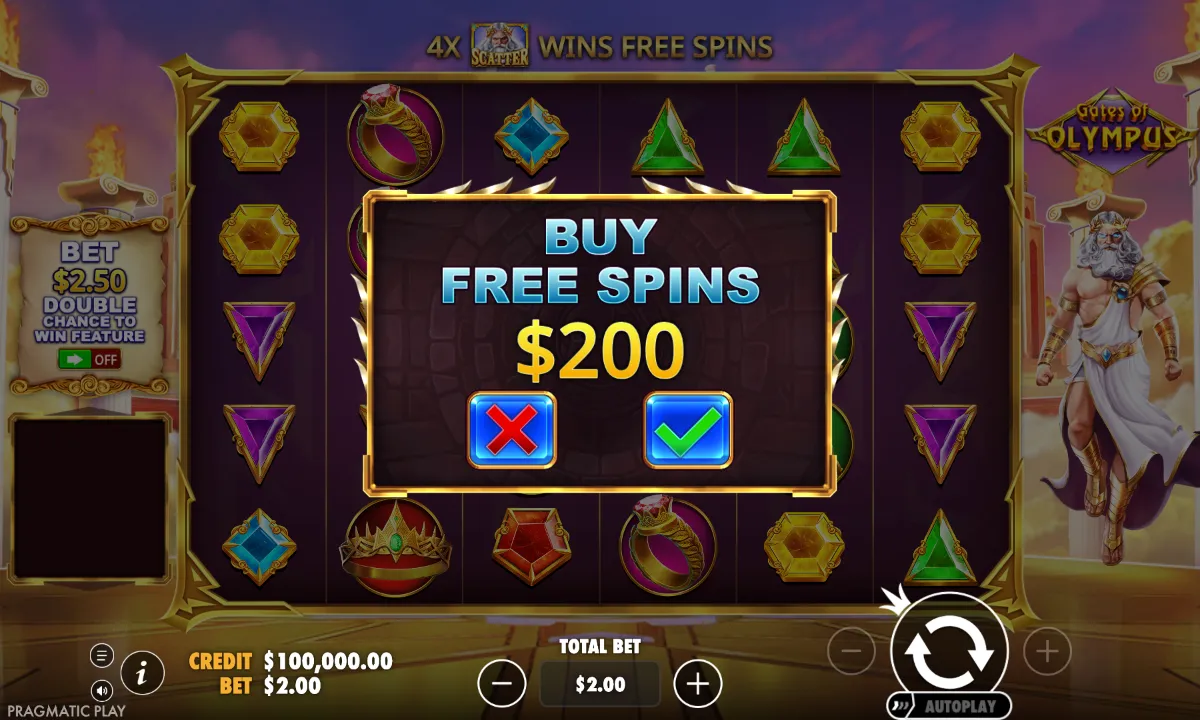 Alongside standard Autoplay and Quick Spin options, which speed up the action when patience runs thin, Gates of Olympus also makes it easier to trigger bonus features. For bold players keen to test their luck against the gods, there’s the popular Bonus Buy option. Here’s the catch, though: buying Free Spins costs 100x your bet. It’s pricey, but it guarantees entry into the Free Spins round. Alternatively, you can double your chances of triggering the feature naturally by enabling the ante bet. This causes the gods to drop more Scatter symbols on the reels, increasing your odds of activating Free Spins — though, of course, nothing is guaranteed. Keep in mind that once the ante bet is active, the Bonus Buy option becomes unavailable.