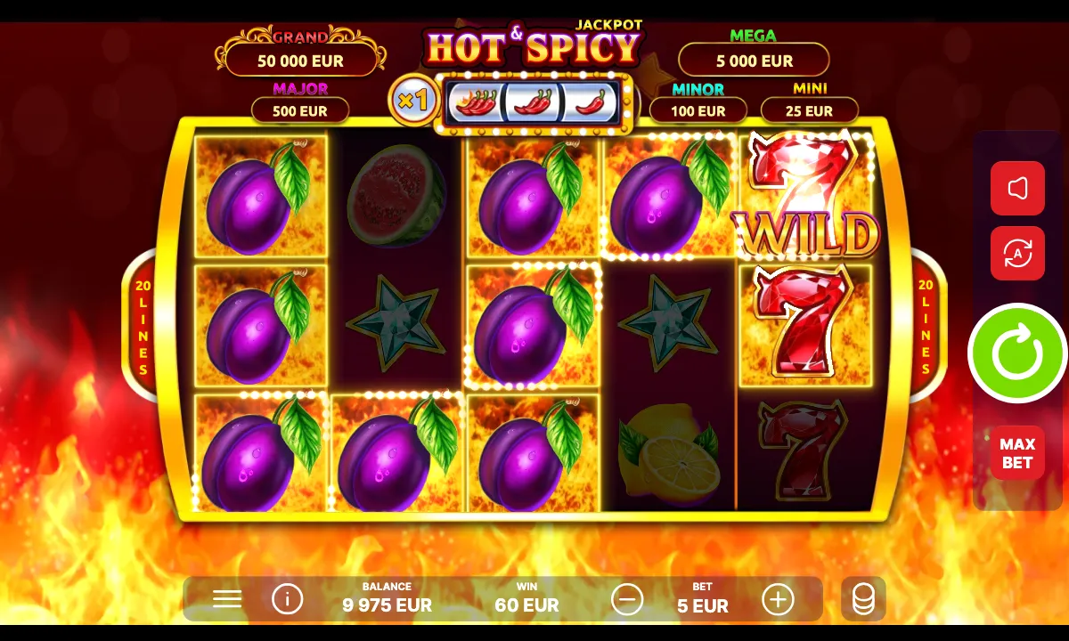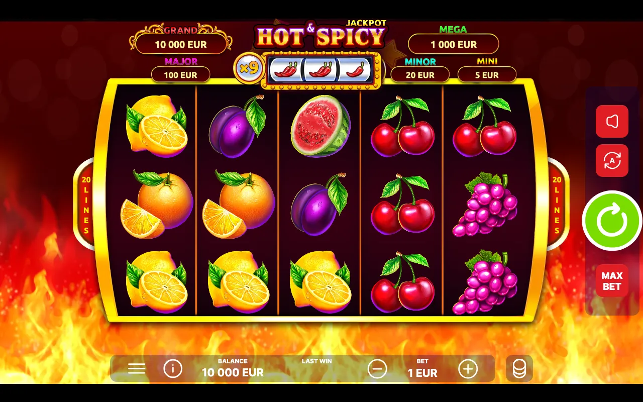 What a seasoned Kiwi player would notice at first sight is that Hot & Spicy Jackpot brings the classic Vegas-style atmosphere to the scorching reels. You feel it through every element: from well-known retro symbols — fruits, 777s, and stars — to the sound of spinning reels and clinking coins.
