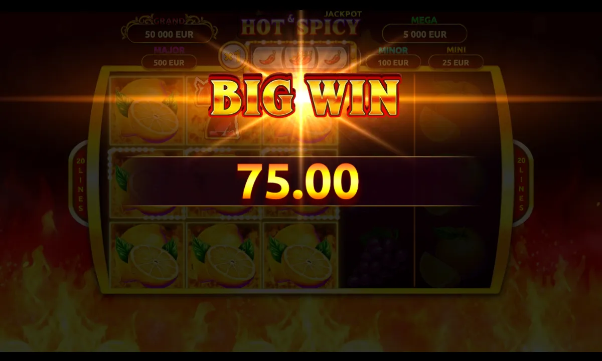 In Hot & Spicy Jackpot, you chase wins across 20 paylines that pay only the highest win per line, left to right. The only exception here occurs when you land 3+ Scatters — they form a winning combination anywhere on the reels.