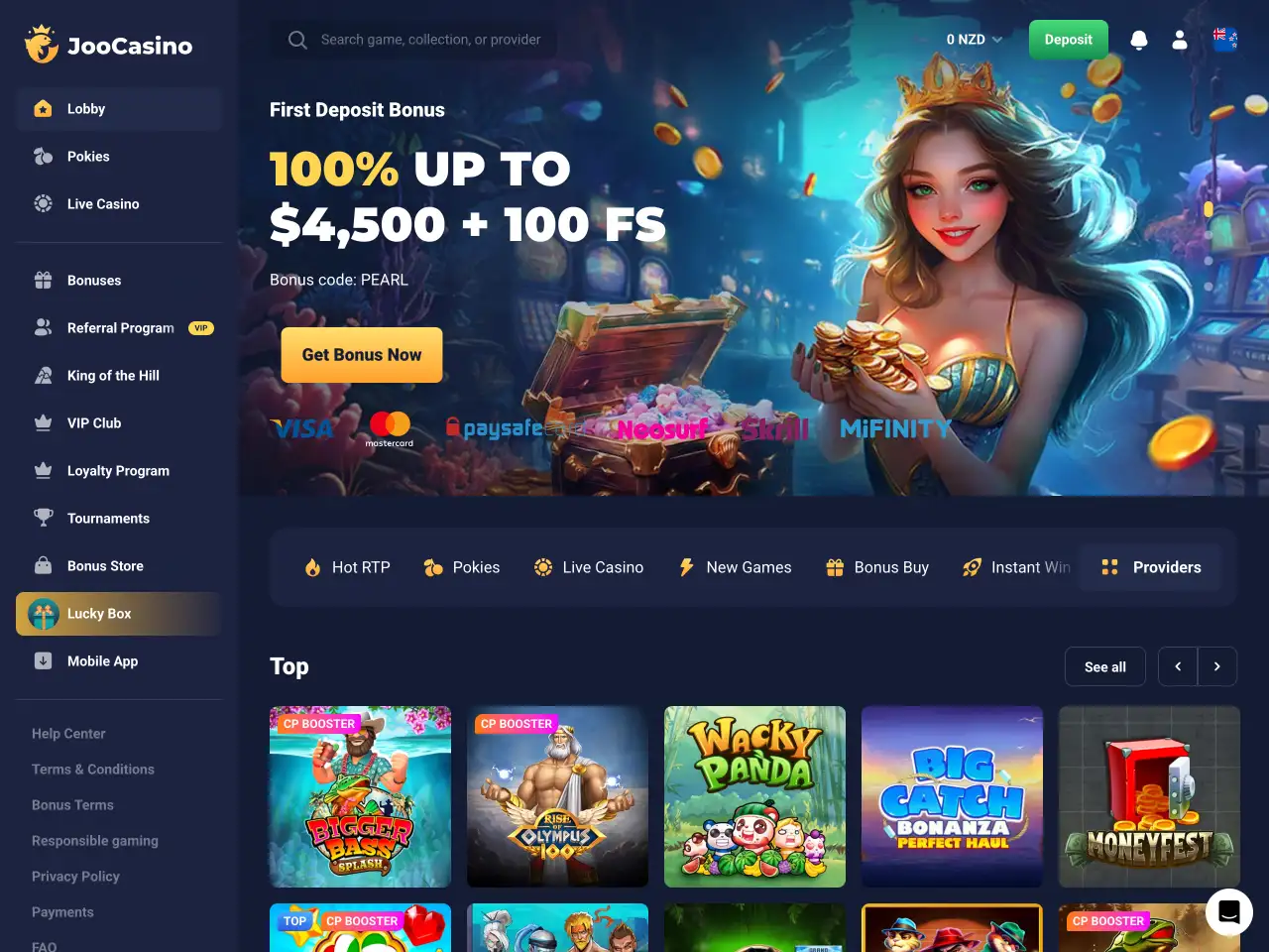 Joo accepts NZD, crypto, cards, and e-wallets. The minimum deposit is $30, and withdrawals are capped at $8,000 per transaction.