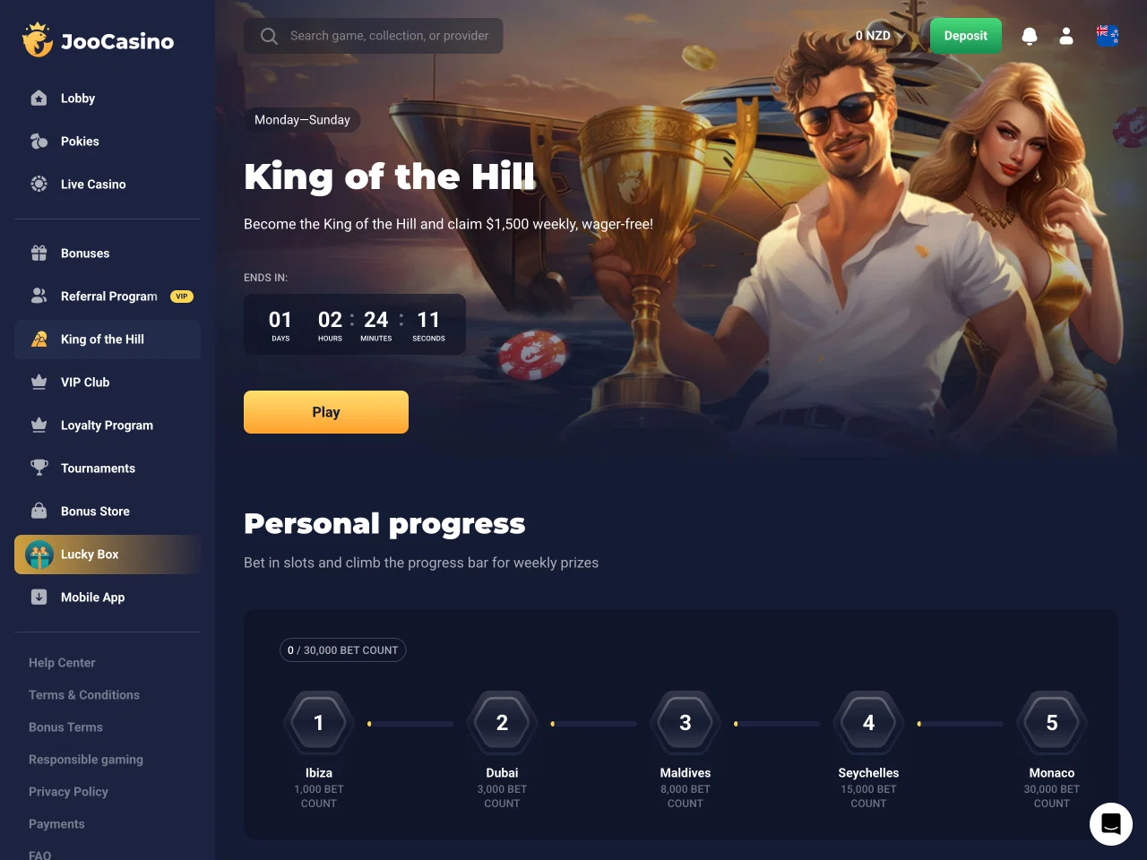 The bonus section at Joo Casino is hard to miss — plastered across the main menu with vivid graphics and promo tiles. The welcome package is impressively large, totalling up to $22,500 and 300 Free spins, split across three deposit bonuses. Players also find daily spins, cashback, and a Lucky Box feature with prizes up to $15,000, though the cost of such boxes is rather high, ranging from $45 to $150. All bonuses have bonus codes that you need to enter when depositing to qualify for the promotion. Talking about codes, players with VIP status can make their own referral link and share it with a friend to participate in the casino’s referral program. If the friend you shared the link with signs up and deposits at least $30, you will get a bonus of $60. The standout feature that you can only find at Joo is its King of the Hill challenge. To take part, you need to bet on pokies, and you will get the chance to become the King of the Hill and get a prize of $1,500. That’s still not all, Joo also offers player comp points that can be collected by wagering real money at the casino’s games and then be spent at the Bonus Shop on different casino promotions.