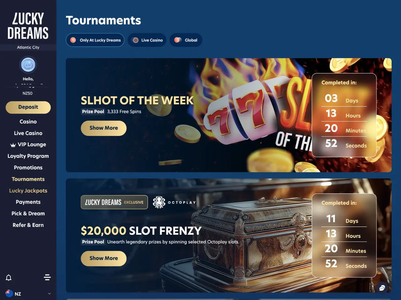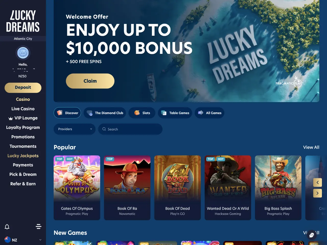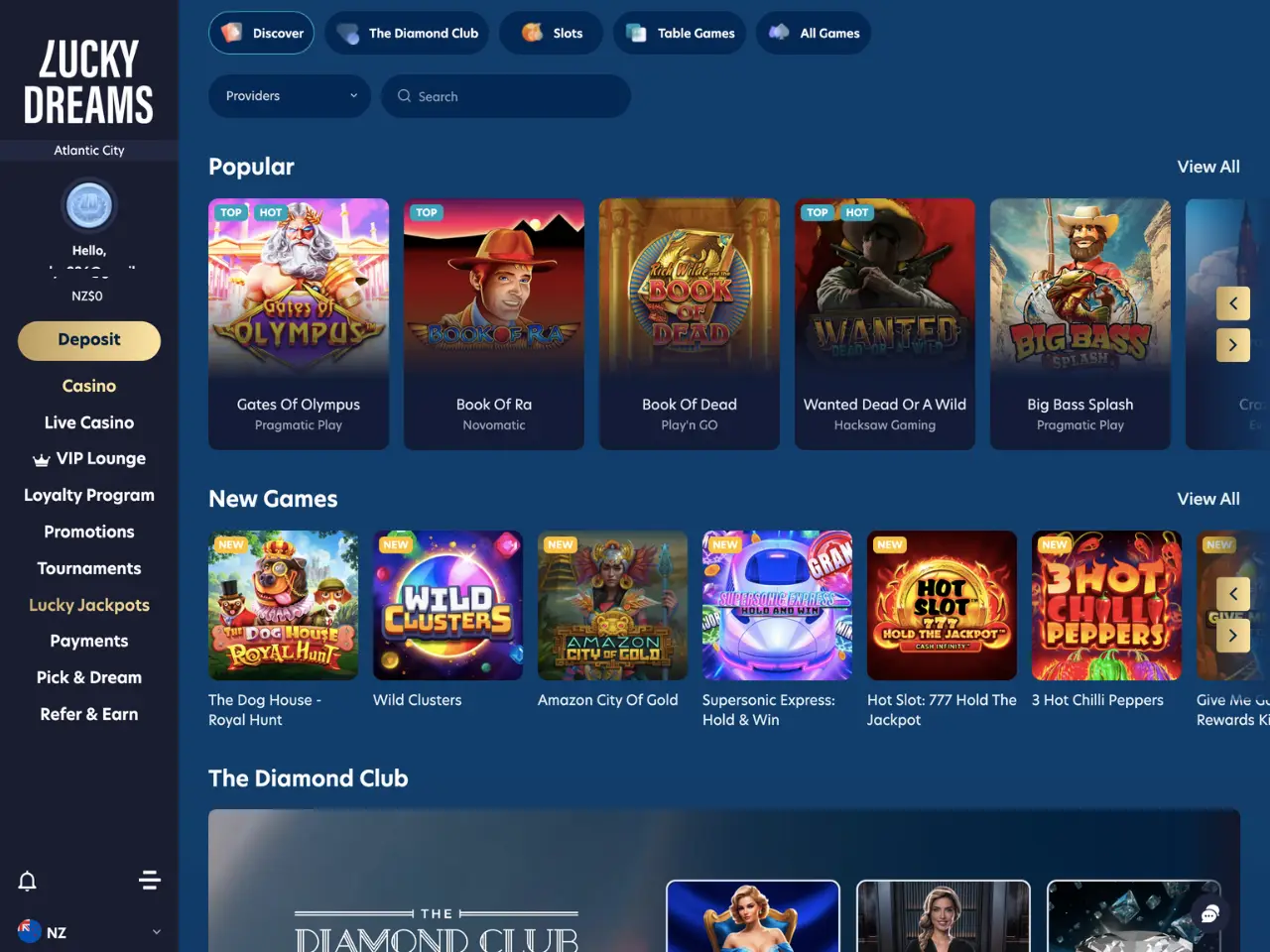 At Lucky Dreams Casino, players can deposit and withdraw using NZD. Many popular payment methods are supported, and deposits are instant. Withdrawals can take up to 5 days, which is slower than the average for online casinos. The casino cooperates with 100+ well-known providers to offer its users over 14,000 games, including pokies, table options, live dealer titles, and jackpots. Customer support is generally efficient, but live chat responses take up to ten minutes. There are loyalty and VIP programs, as well as a Diamond Club, to improve the user experience even more. Some players have mentioned issues with account verification delays in online forums, though no such problems were encountered in our testing.