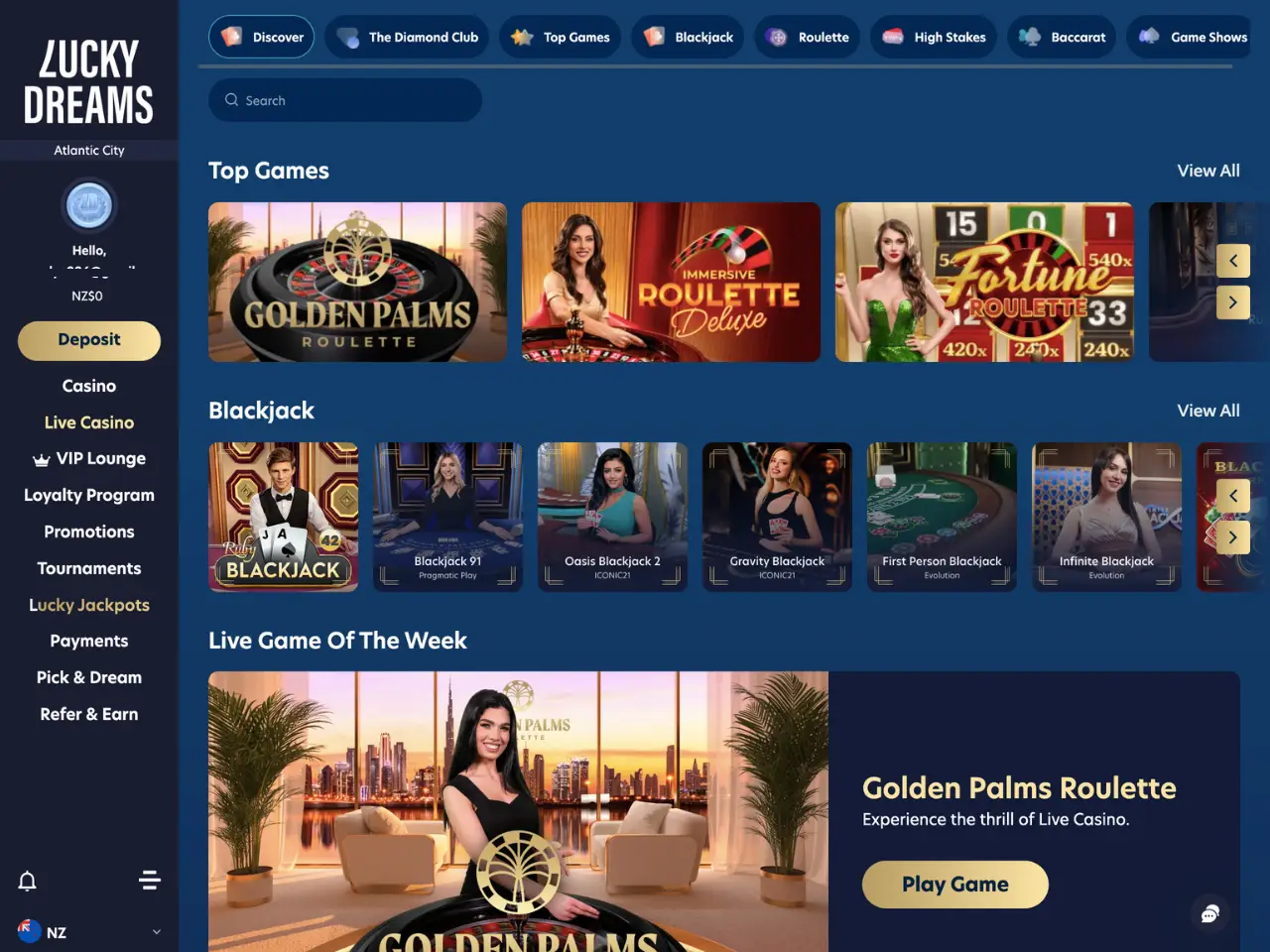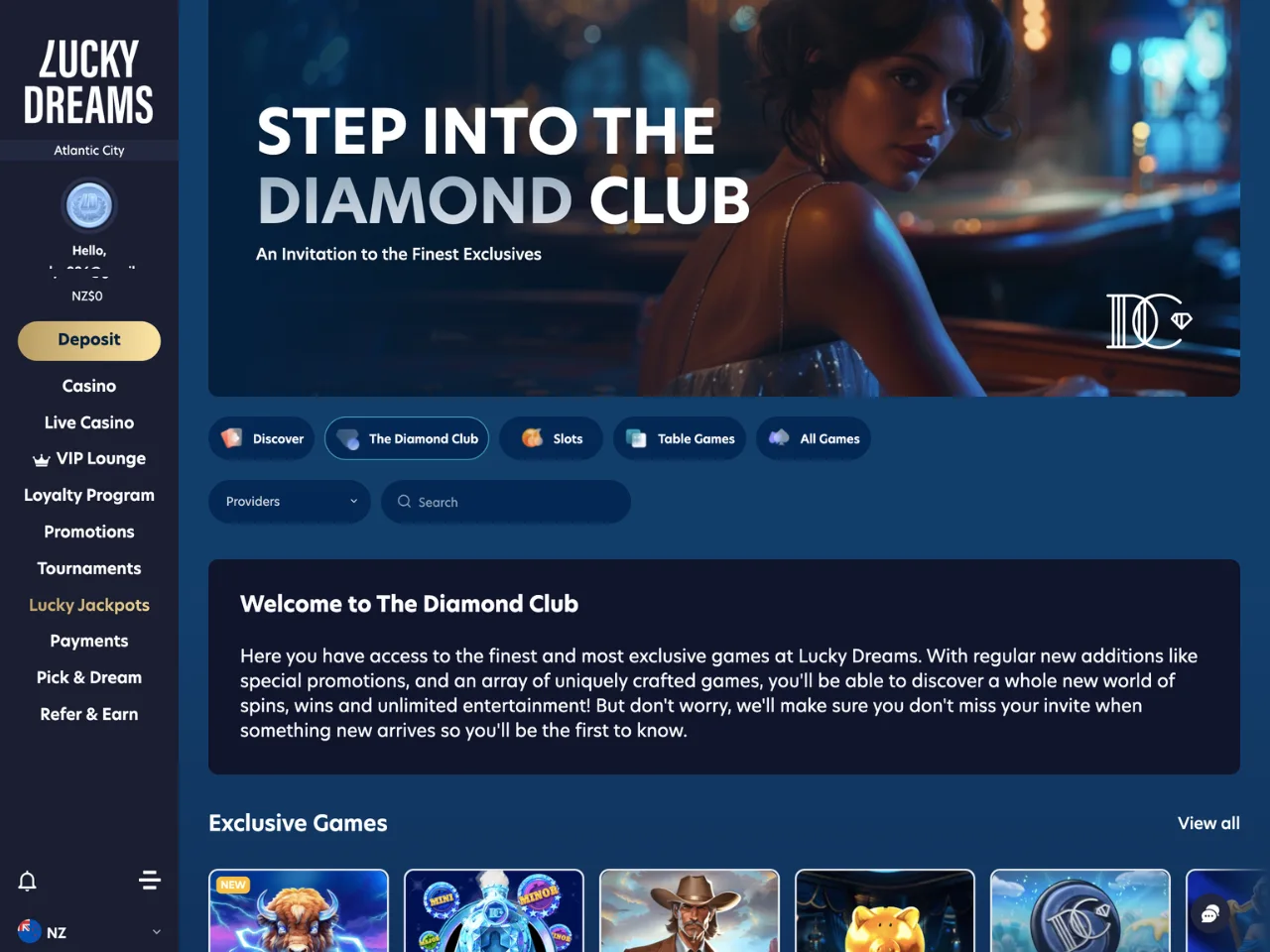As one of the best online casinos, Lucky Dreams offers an unrivalled selection and variety of over 14,000 different games and counting. Categories include table games, jackpots, live dealers, and even pokies. The live casino section is good, offering more than 100 titles like high-stake blackjack, roulette, baccarat, game shows and even gamble shows. All titles also feature modern graphics and superb loading speeds. Even more, members of the Diamond Club are treated to a selection of exclusive games, unique promotions, and other perks tailored for a more captivating experience. To become a member, you just need to create an account at Lucky Dreams Casino.