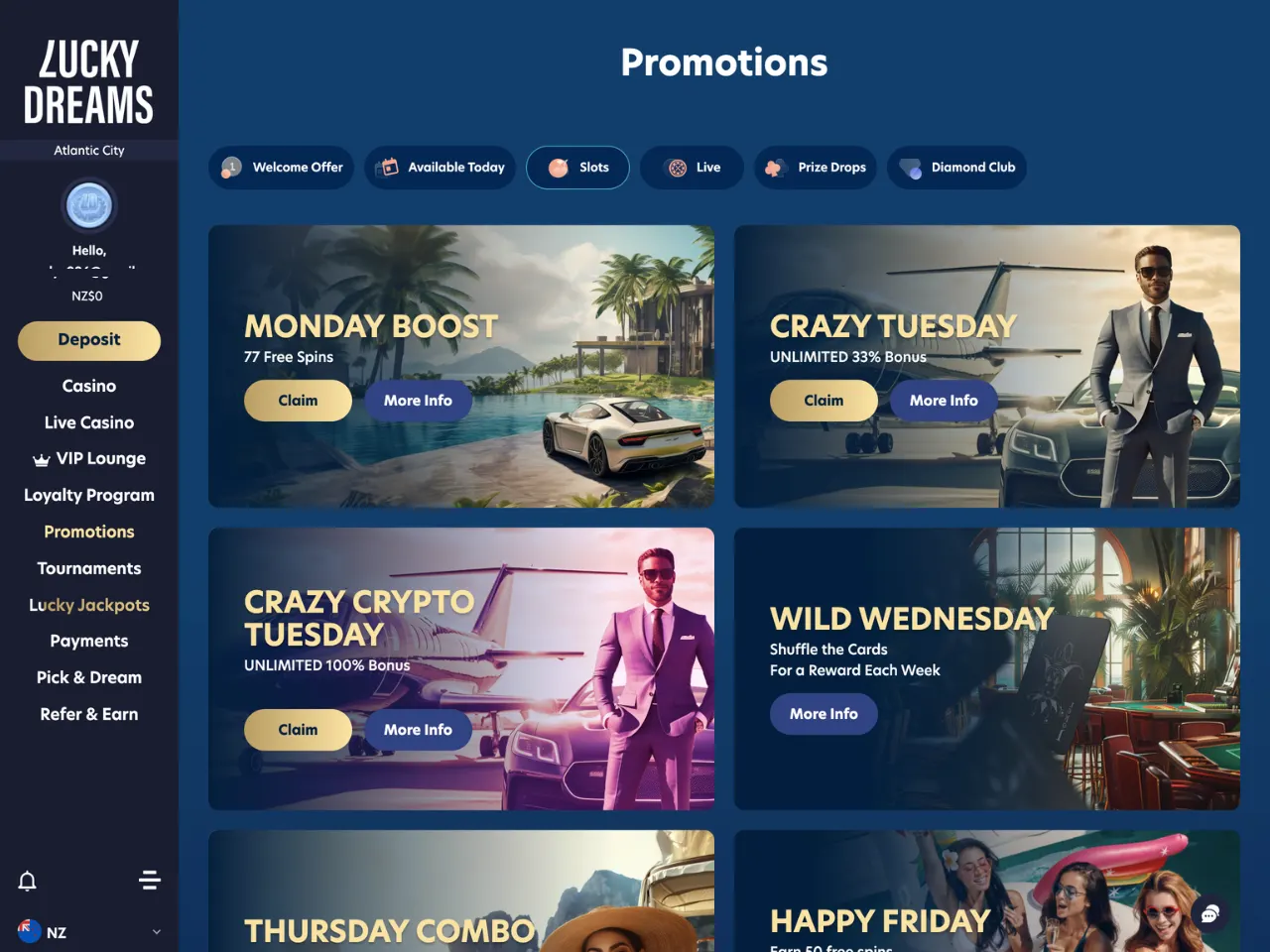 Promotions at Lucky Dreams Casino are very diverse. For example, for new players, there are two welcome offers. The first one is a welcome bonus of up to $10,000 + 500 Free Spins (which is considered to be big compared to other gambling platforms) for the first five deposits, while the second one is a high-roller promo for users who enjoy making large transactions. In addition to that, this casino provides users with reload promotions for pokies and live games, including free spins and real money rewards. For members of the Diamond Club, there are bonuses like 10% cashback every Tuesday and a $1,000 reward randomly dropped every day (to try your luck, just play on any Diamond Club Exclusive Game)! Moreover, at Lucky Spin, you can try your luck at a special Pick & Dream promo and get a random prize every day just by depositing $30 or more with the promo code DREAM.