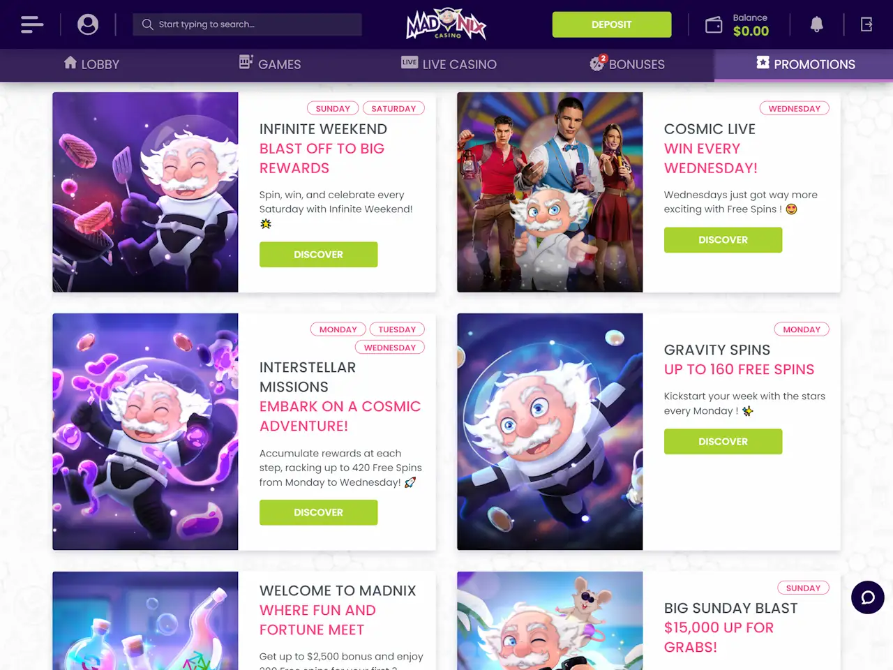 MadNix provides new players with a welcome pack for their first three deposits. In addition to that, there are reload offers for every day of the week, except for Thursday. They include Infinite Weekend rewards, Gravity Spins up to 160 every Monday, Cosmic Live free spins every Wednesday, Interstellar Missions with up to 420 FS for wagering from Monday to Wednesday, Big Sunday Blast with up to $15,000 reward for playing your favourite games, and more.
