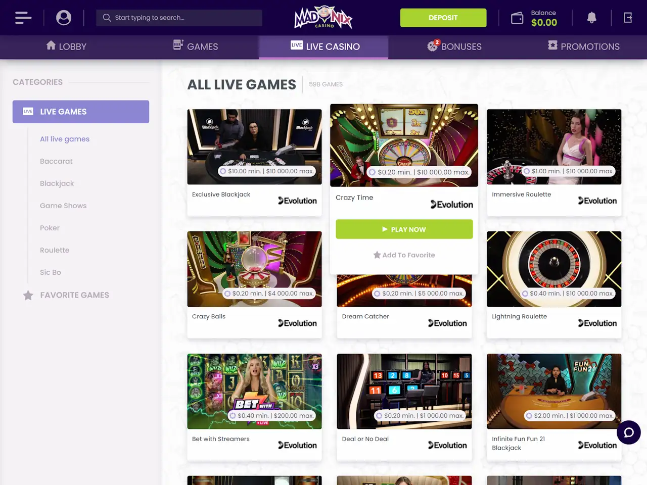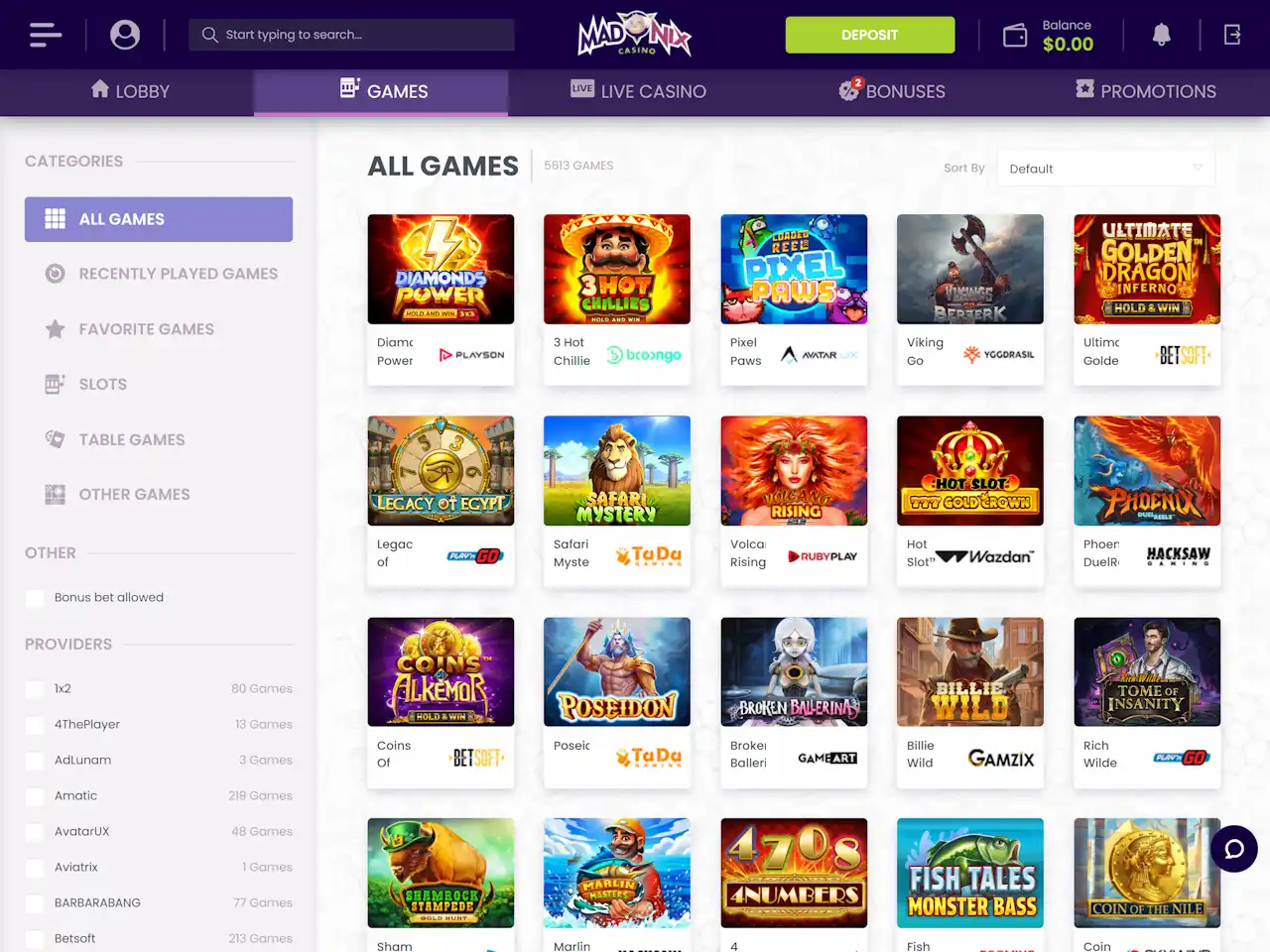 MadNix works with more than 60 software providers, including industry leaders like Booming Games, Netent, Play’n GO, Pragmatic Play, Redtiger, Wazdan, and Yggdrasil. Pragmatic Play contributes the most games among other creators — over 400 titles. On the other hand, Amatic appears to contribute the most games across pokies and table categories, while Evolution focuses only on live dealer titles here, covering roulette, blackjack, baccarat, and game shows. The full provider list is shown on the Games page in the menu on the left side of the screen.