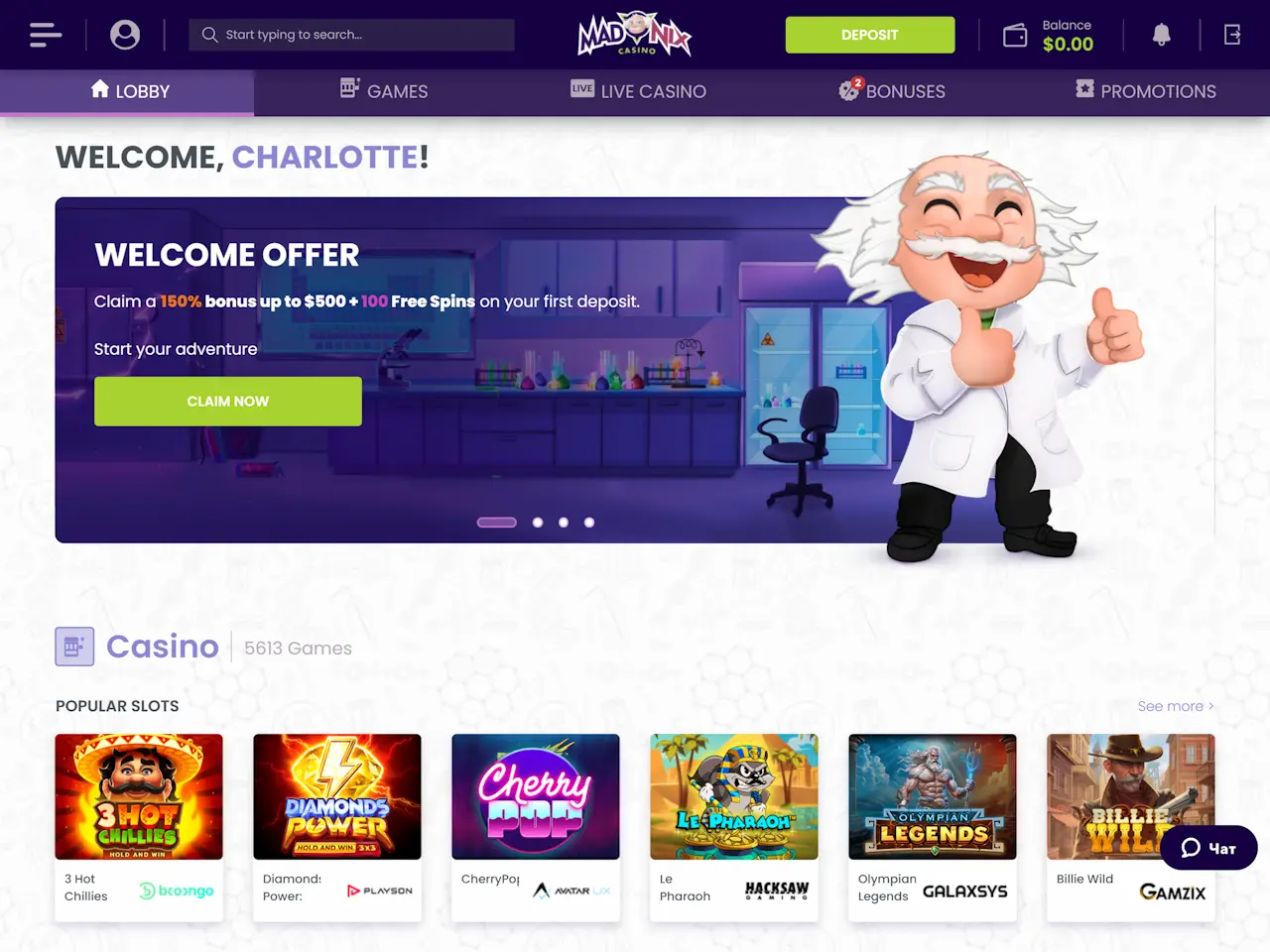 MadNix Casino was established in 2019 and licensed by the Curaçao Gaming Control Board. This gambling website attracts players with its science-inspired cartoon theme, more than 600 live dealer games on offer, almost daily reloads, constantly updating tournaments, and so much more. Also, players have an opportunity to install a desktop application for added convenience. The BetPokies team checked everything about MadMix Casino for you to see the whole picture!