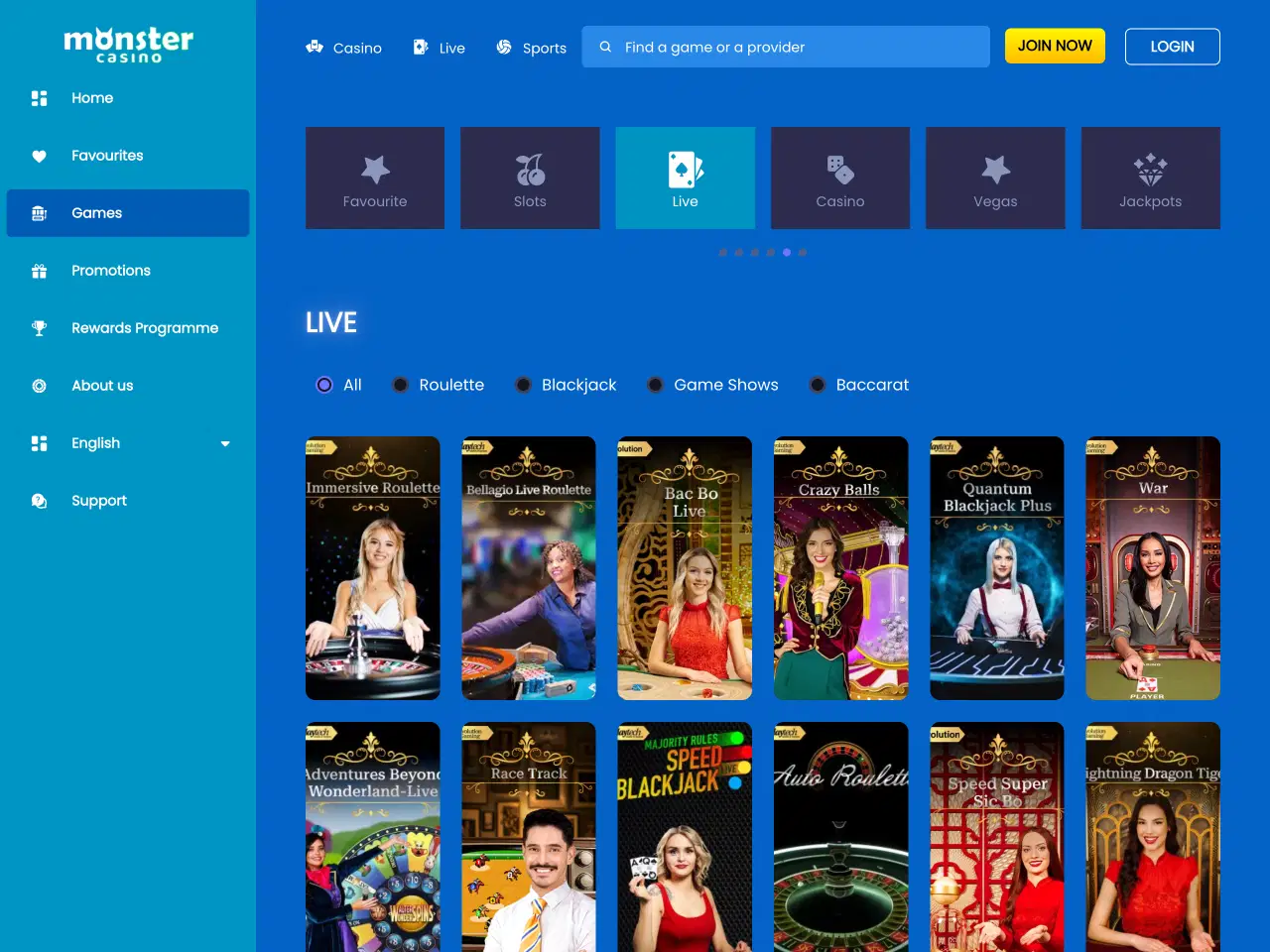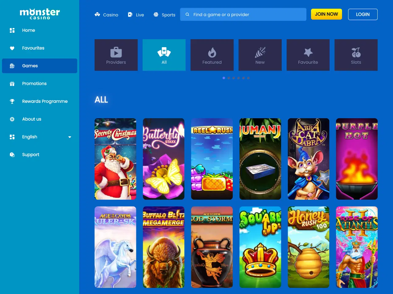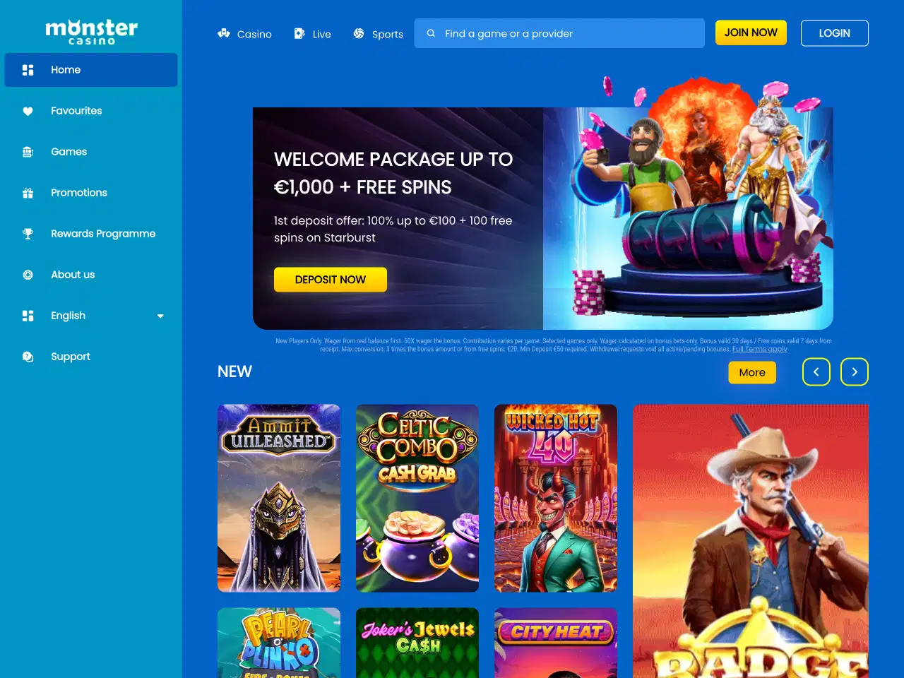Compared to other platforms, Monster Casino doesn’t offer a wide variety of titles, only around 2,500. We counted more than 100 live dealer tables — covering roulette, blackjack, baccarat, and even unusual picks like War and Crazy Pachinko. New section shows a carousel of brand-new slot releases, neatly organised and regularly updated, which is a nice opportunity for the players as they can constantly explore something new. Yet, it worth noting that some games load slowly — especially the live ones — but they eventually work.