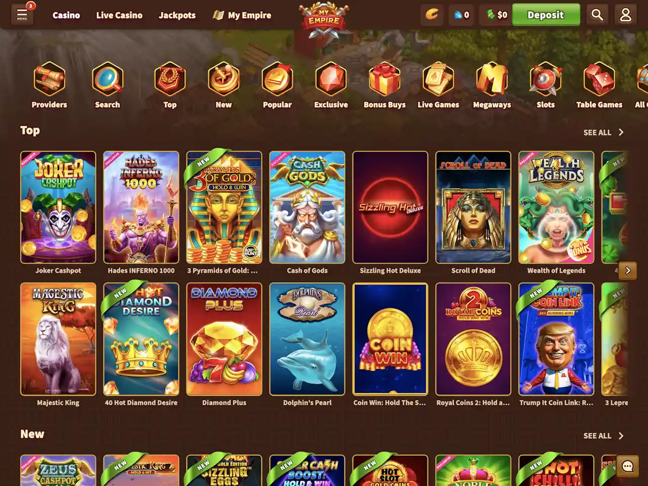At My Empire Casino, pokies games are the most popular among players, featuring a variety of themes and innovative features. The most prominent titles are Big Bass Vegas Double Down Deluxe, Cash of Gods, Gates of Olympus 1000, Joker Cashpot, and Royal Coins 2: Hold and Win. These games have an RTP level of over 95% and bright designs that attract a lot of players. The casino also offers a selection of table games, including blackjack, baccarat, and roulette, as well as live dealer options for real-time gaming experiences. This diverse game library helps the casino meet the needs of a wide range of players.