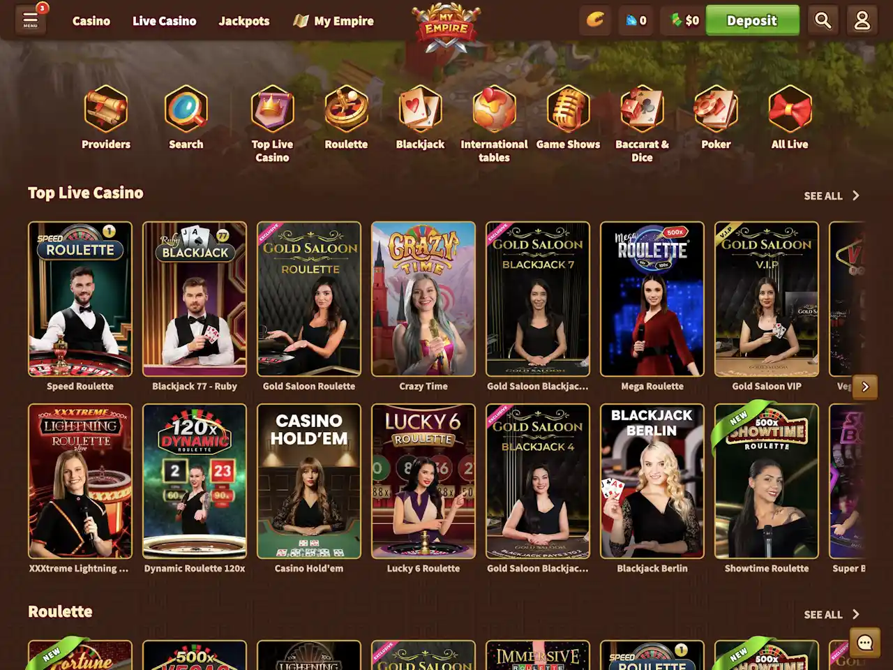 My Empire Casino offers its users a good collection of various games. On this website, you can enjoy a variety of pokies, table games, live titles, and jackpots. All the gambles are divided into many categories for users’ convenience. For example, in the Live Games section, there are 200+ different versions of roulette, baccarat, and blackjack with experienced live dealers. Table game fans can play blackjack, roulette, and baccarat at My Empire Casino as well. Besides, on this platform, you can find Megaways, Bonus Buys, and exclusive titles like Plinko Party, Flame Fruits Frenzy, Tasty Bonanza, and Burning Sun.