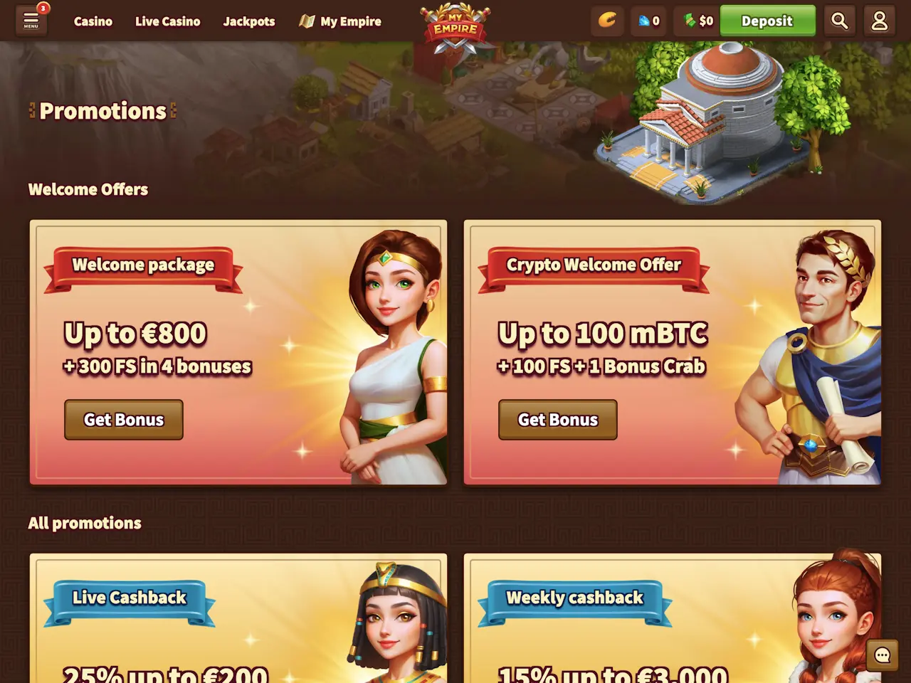 My Empire provides its players with several offers to make their gaming experience better. In addition to the welcome package available on your first four deposits, there is also a crypto welcome bonus for players who use cryptocurrencies. Besides, there are also weekly reloads in cash and free spins, as well as live game special bonuses. To make your gaming experience even more exciting, My Empire Casino provides you with a Bonus Crab through which you can get more prizes. Furthermore, check out the Bonus Market of the casino and trade diamonds for free spins and real cash. You have two sources from which you can get casino diamonds: deposits and bets. In case you make a deposit, you are added 50% of your deposit to your diamond account. Apart from that, one diamond is given for each ~$18 you bet. Also, you can collect these diamonds and use them in the Bonus Market.