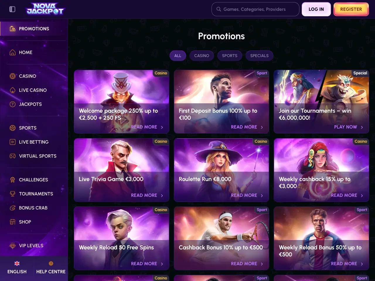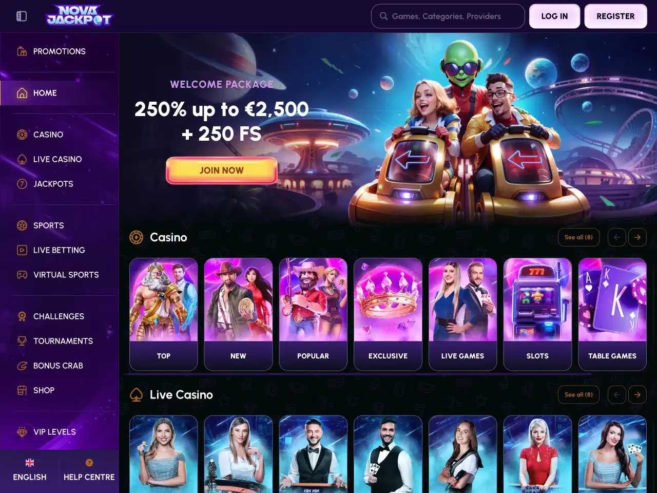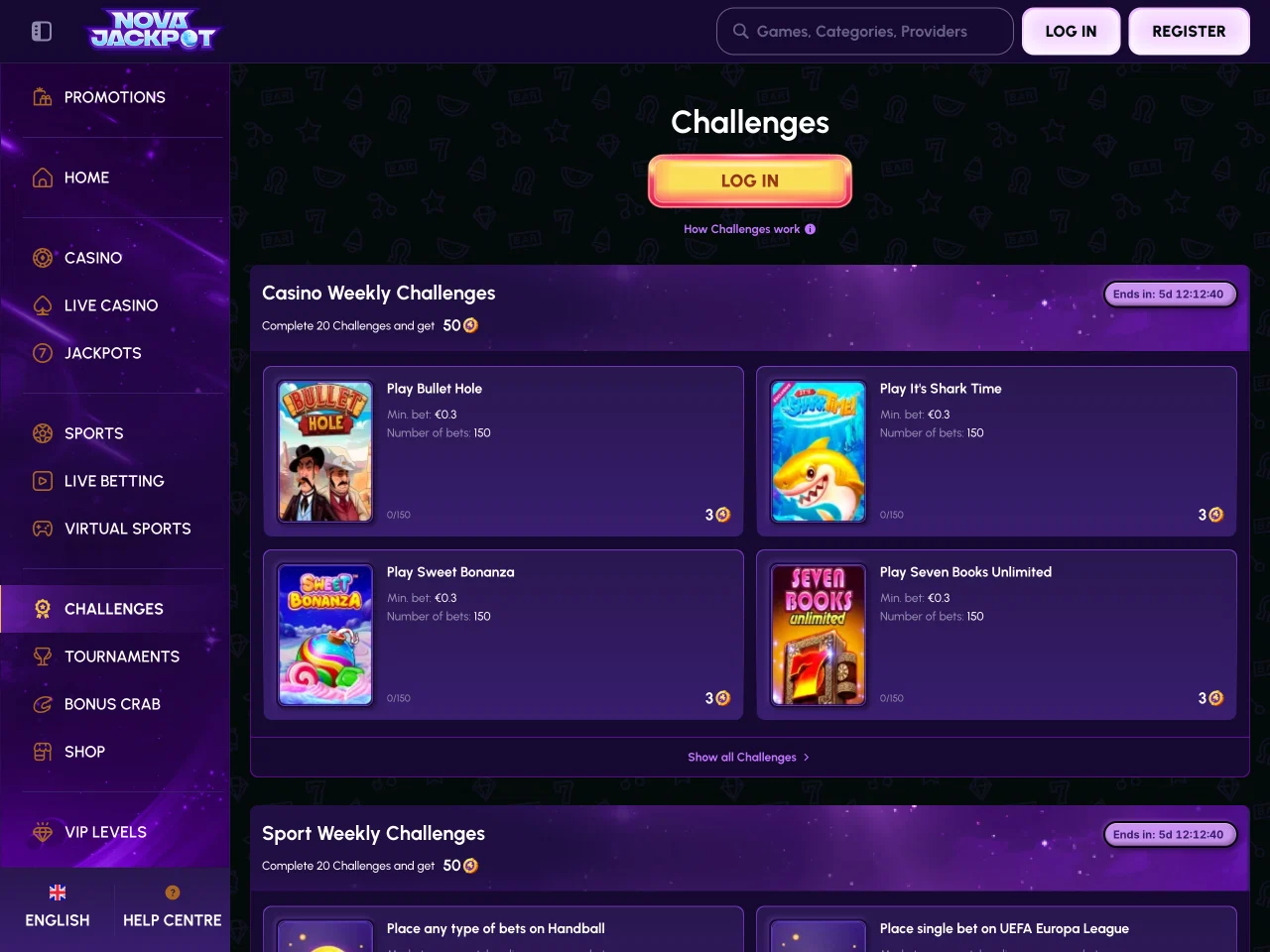 At NovaJackpot, gamblers can dive into exploring over 13,000 game titles, including several exclusive titles and 250+ live games. There, they can also find Live Trivia games, where they can win up to $6,000 by giving the right answers to the True or False questions. If players want a bit of gamification, NovaJackpot offers them to take part in Challenges, where they can earn points and spend them at the Bonus Shop.