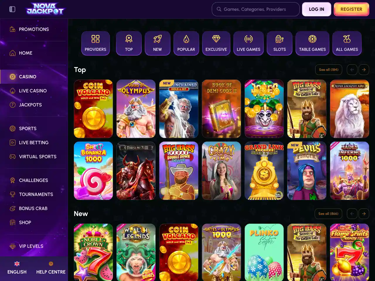 The Popular tab on NovaJackpot includes a fixed list of titles displayed on the homepage; games like Gates of Olympus 1000, Legacy of Egypt, Royal Coins 2: Hold and Win, and Lucky Dwarfs are featured there. Each game opens in a separate window with demo and real-money modes available. Most loaded quickly during testing. Some, however, took longer than expected or displayed a black screen before reloading; this happened mostly with slots labeled as Bonus Buy.