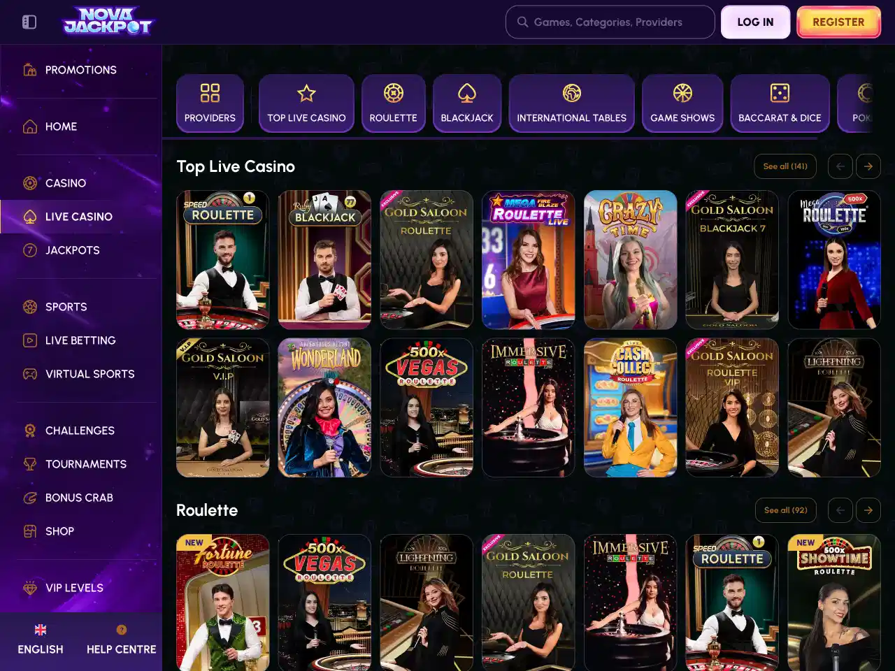 NovaJackpot features over 13,000 games, with 250+ titles in the live casino category. More than 100 of those are live blackjack and roulette tables. Available categories include slots, roulette, blackjack, baccarat, craps, dice, keno, bingo, scratch cards, and video poker. In addition, layers can access exclusive games in the Exclusive tab. At NovaJackpots players can also participate in Live Trivia games, where they have a chance to win up to $6,000. Table games are available in both live and virtual formats, so everyone can choose based on their wishes. The site presents a wide scope of gambling formats, though a few games did not open during testing, which was inconvenient. Game types are clearly grouped and easily browsed. The live dealer section is especially dense compared to competitors and every major category is represented.