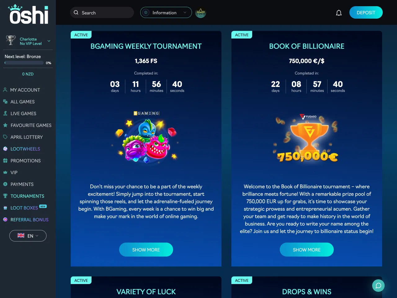 Oshi’s bonus structure includes a four-part welcome offer totaling up to $6,000 and 200 free spins. Each deposit, with a minimum $30, unlocks a bonus: 100% on the first, 75% on the second, 50% on the third, and another 100% on the fourth. The wagering requirement is x45 for all. Reload bonuses (20% plus 30 FS) and daily Lootwheel spins offer guaranteed prizes — up to $5,000 or hundreds of free spins. We also found Lootboxes, unlocked by deposits, promising up to $6,000 in rewards. VIP players can receive weekly cashback of up to 10%, depending on comp points. Besides, Oshi provides seasonal promotions, such as the spring April Lottery. However, there’s only one reload bonus of 20% and 30 Free Spins, but no cashback bonus for regular players.
