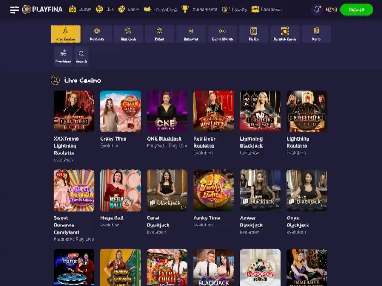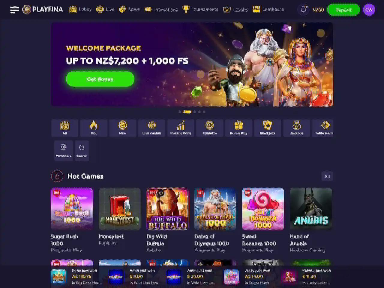Playfina Casino offers its users 12,000+ games that are divided into different categories, such as pokies, table options, live titles, and jackpots. With such a large collection of games, Playfina is one of the biggest gambling platforms featured on the BetPokies website. In the Live Casino section, you can find more than 400 gambles with experienced live dealers, including blackjack, poker, roulette, baccarat, keno, scratch cards, sic bo, and game shows. For table game fans, there are also different versions of roulette, blackjack, and baccarat. In addition to that, there are separate categories with instant-win titles and bonus buys.