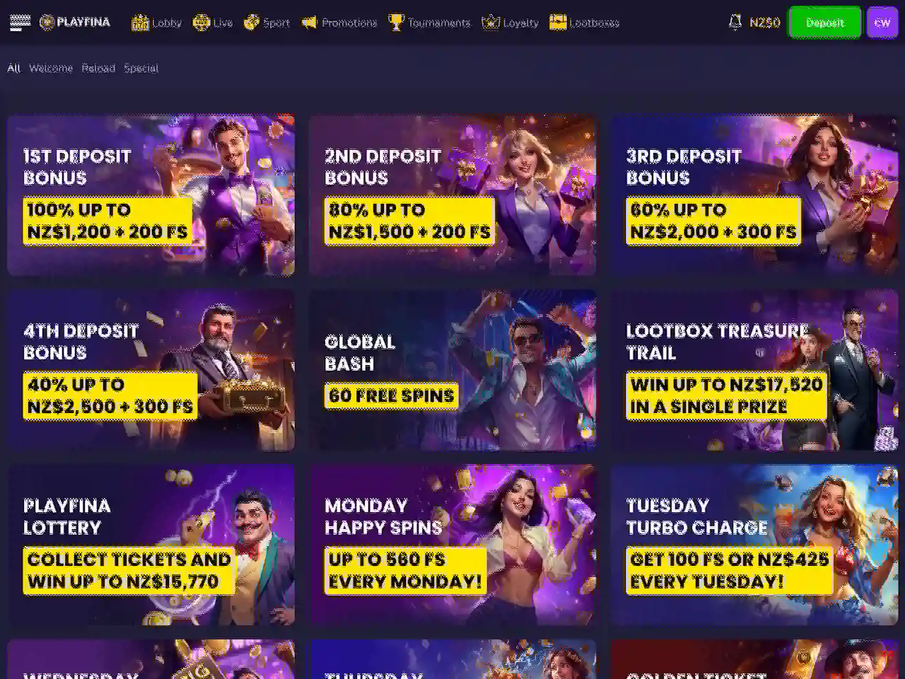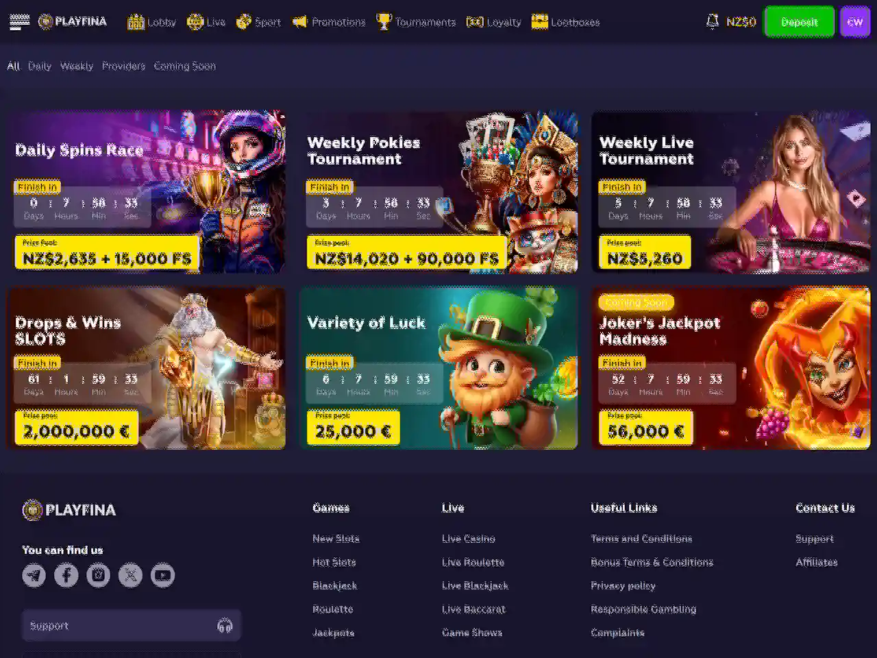 Yes, Playfina Casino accepts deposits in various currencies, including NZD. The preferred currency can be chosen during the registration process at this casino.