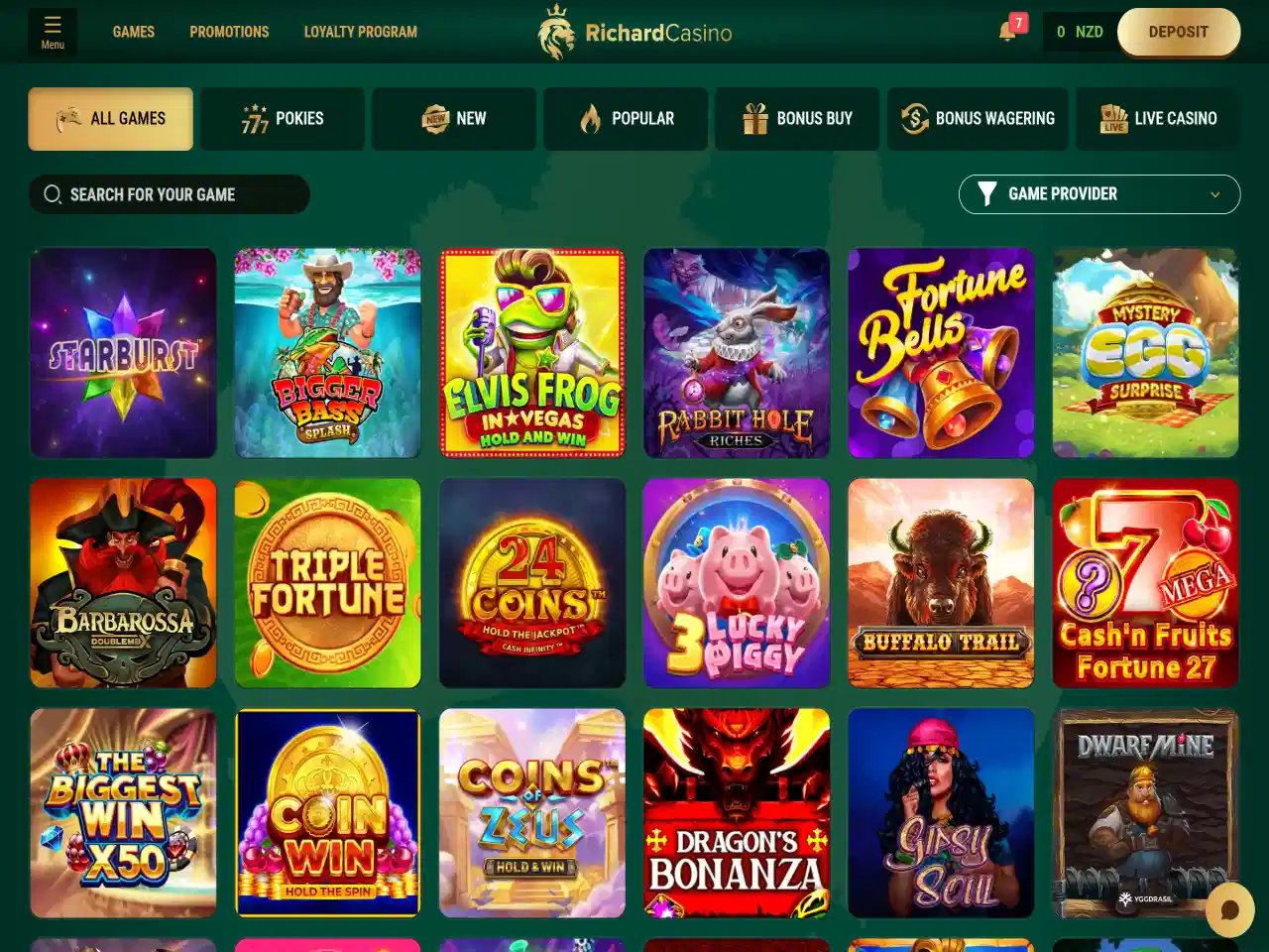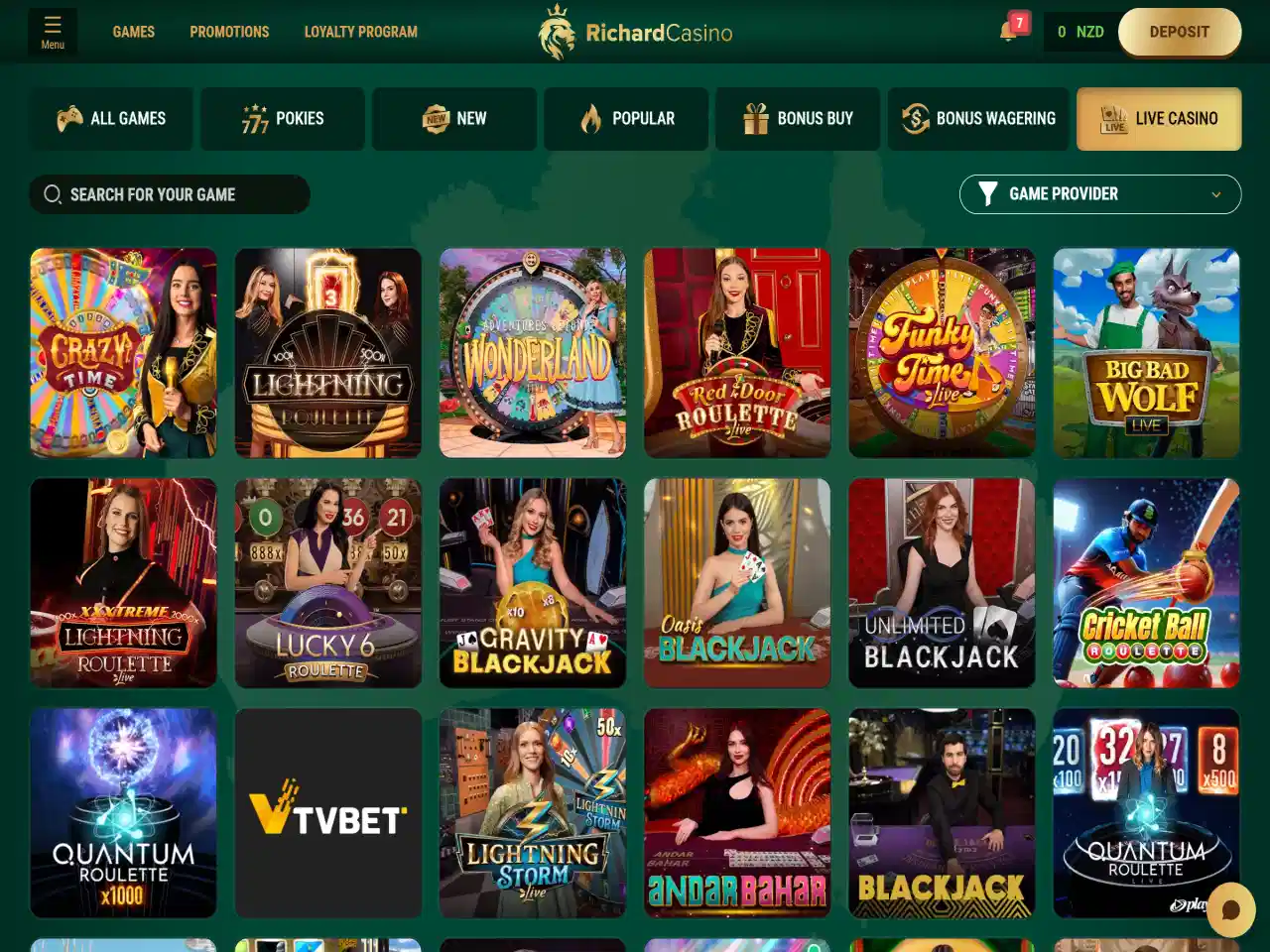 Richard Casino features a vast catalogue of more than 8,000 games, easily confirmed by navigating through its All Games tab. Players can access pokies, live games, and table options, with distinct sections for each. There are also Bonus Buy and Bonus Wagering sections. However, the lack of detailed filters makes browsing the game library less efficient. More than 100 live casino games are present, but not prominently categorised by their type. Yet, they include blackjack, roulette, baccarat, game shows, and keno. For added transparency of the gameplay, there is a Provably Fair feature. Navigation can be a bit of a mission. Still, if you’re keen on variety, this library is a choice — heaps to explore.
