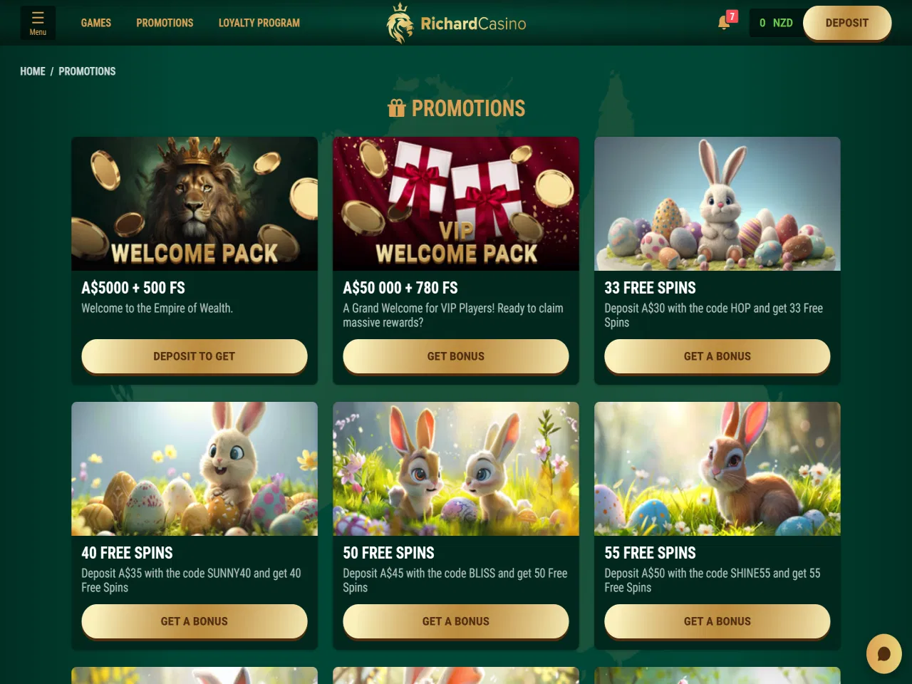 Richard Casino has a welcome bonus split across three deposits. In addition to that, there is a VIP welcome pack for VIP players with massive rewards. Moreover, Richard Casino provides players with a variety of free spin offers, weekend reloads, and even a Birthday bonus. The site also features a Wheel of Fortune bonus mechanic, where players can spin for prizes like free spins or cash rewards by depositing $60 and entering a promo code. Temporary promos dedicated to different international holidays throughout the year are present as well.