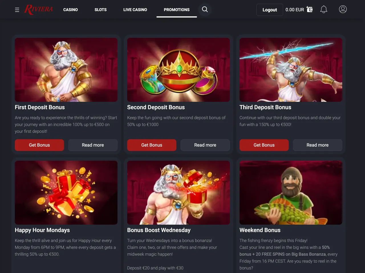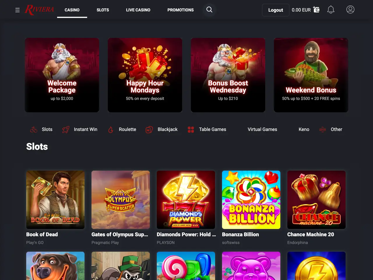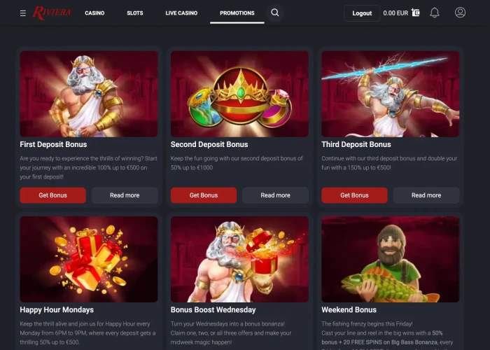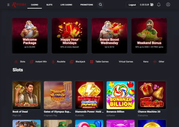 Riviera Casino greets new players with a three-part welcome package worth up to $2,000 in bonus funds. Beyond that, the promotions calendar is steady but not overwhelming, offering several recurring opportunities to boost gameplay. Weekly deals include a 50% reload during Happy Hour Mondays, tiered Bonus Boosts every Wednesday, and a Weekend Bonus on Fridays that combines a 50% match with free spins on Big Bass Bonanza. The absence of cashback or rotating daily offers may disappoint bonus chasers, but the consistent lineup ensures regular players always have something rewarding to claim.