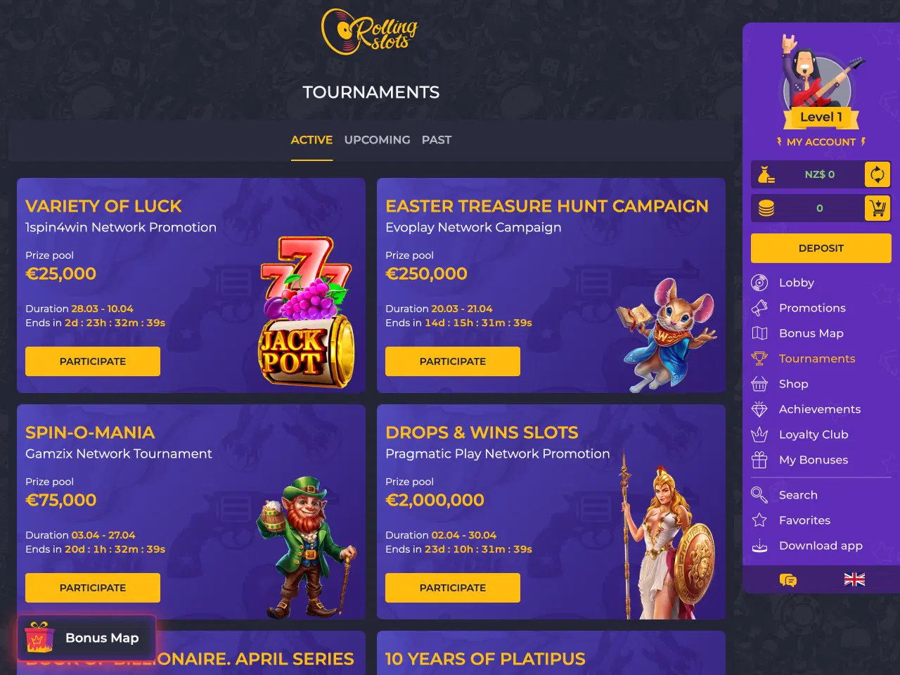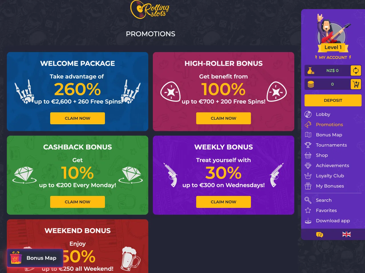 Rolling Slots Casino offers its players a high-class gambling experience with a considerable game lineup of over 16,000 games. While gambling on the platform, users can become members of the five-level VIP program that provides them with more promotions, a personal manager, free spins, and level-up bonuses. The casino also features a unique Bonus Map, where the players can virtually travel around Europe and claim daily bonuses. In addition, at Rolling Slots, you are provided with the Achievements system, where you can play various games and be active on the website, in order to receive coins and exchange them in the Bonus Shop.
