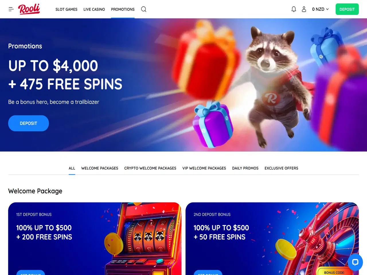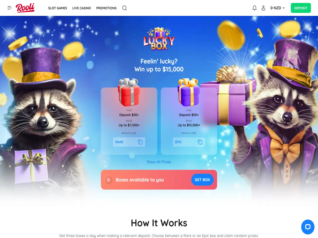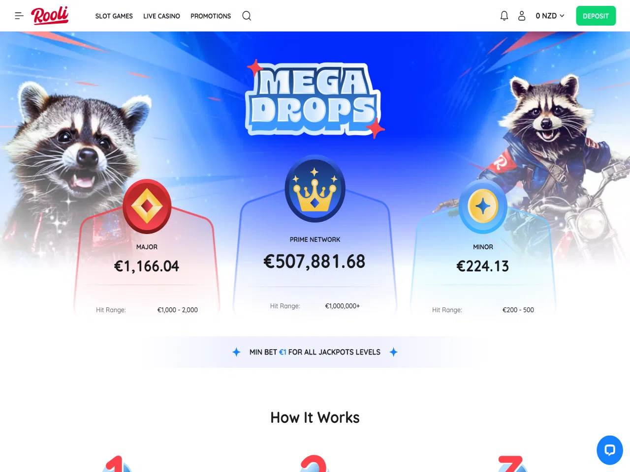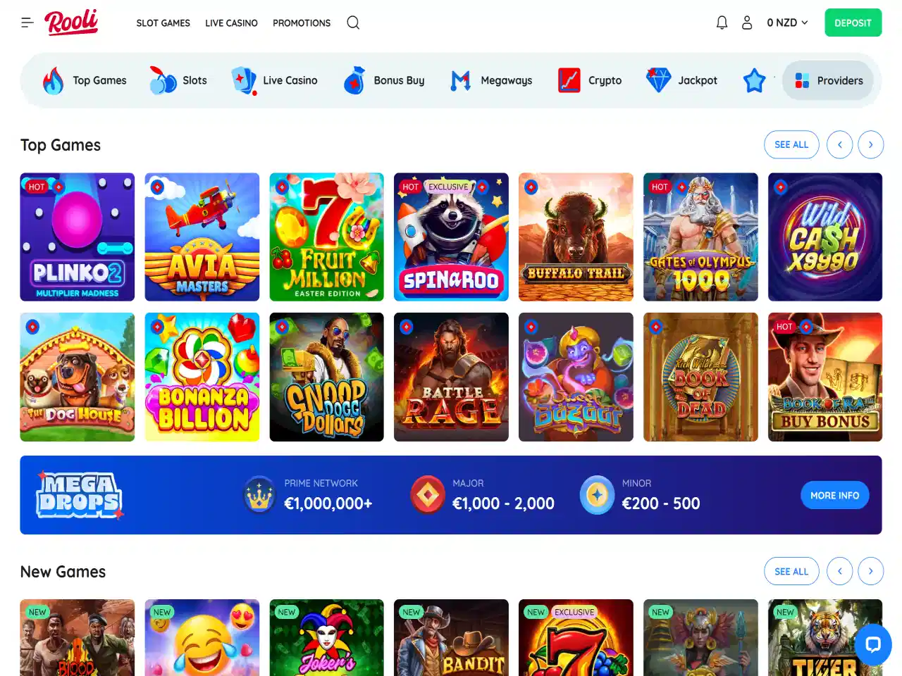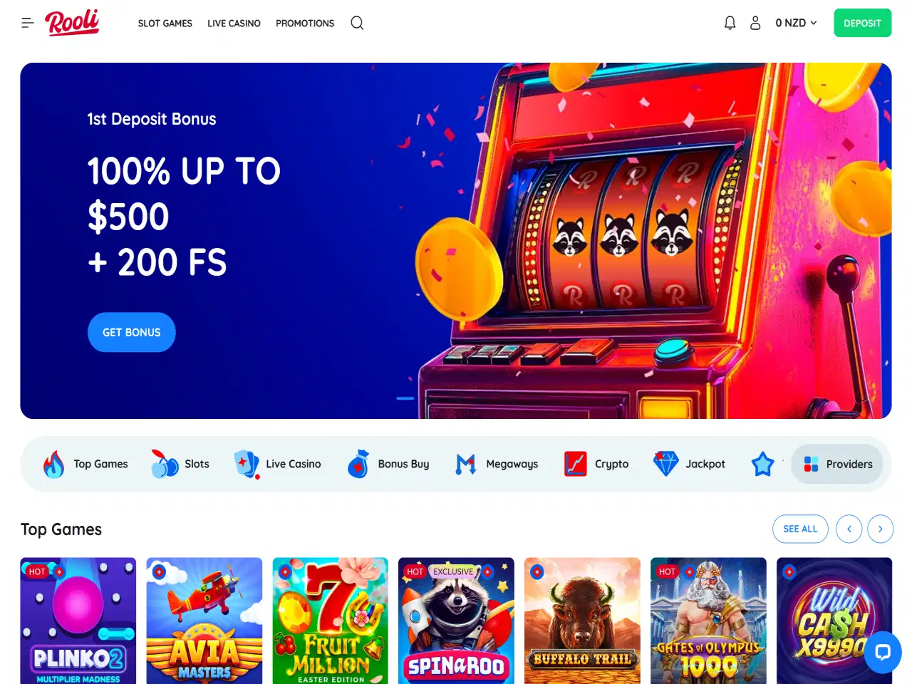 Rooli Casino engages players with a pleasant raccoon-themed interface, more than 100 live dealer titles, weekly promotions, a Lucky Box offer with surprise prizes, Mega Drops that provide no-wagering winnings, and more. Rooli supports nearly 15 convenient payment methods and allows NZD transactions. Yet, some users have reported a slow verification process, which can consequently postpone withdrawals. Customer support is available 24/7 via e-mail or live chat, where the requests are typically resolved within a few minutes.