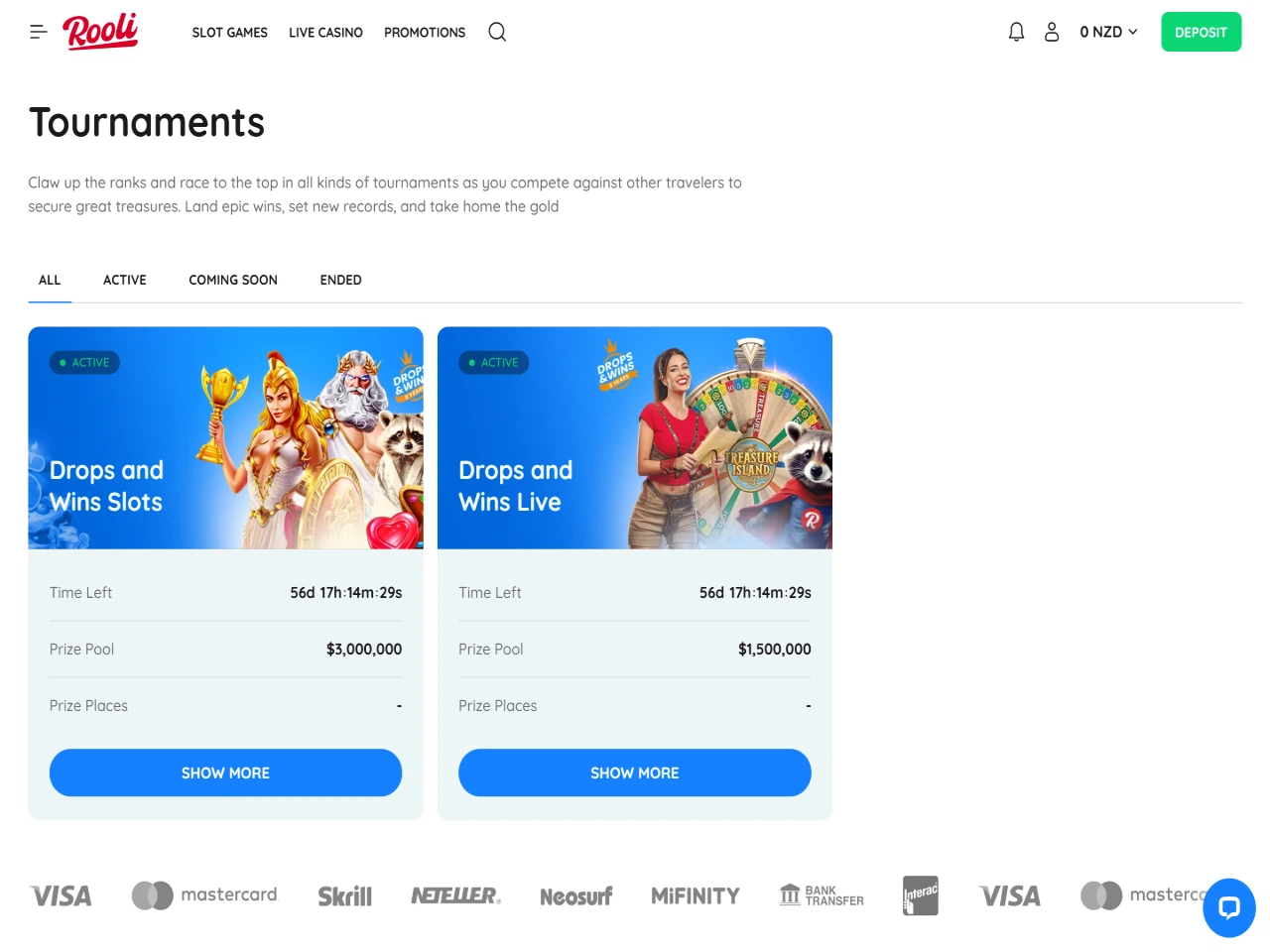 Rooli supports a range of payment options, which are listed clearly on its cashier page. Available methods include credit/debit cards, e-wallets, vouchers, bank transfers, Apple Pay/Google Pay, and crypto. The minimum deposit is $20. NZD is fully supported — players can select it when creating an account or making a deposit. For withdrawals, users can choose from a similar selection of payments. Withdrawal times vary depending on the chosen method. Crypto and e-wallets usually take a couple of hours, while bank transfer transactions are usually processed within one to three business days. That said, delays can crop up if your ID isn't accepted straight away. Also, some players mentioned in their reviews about this gambling platform that the identity verification can be quite lengthy.