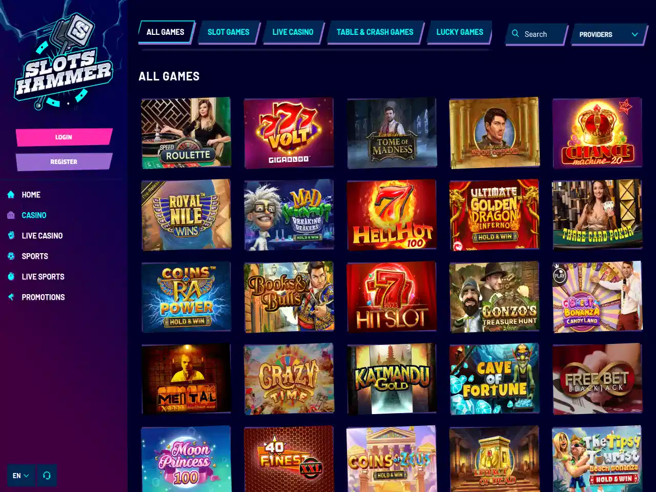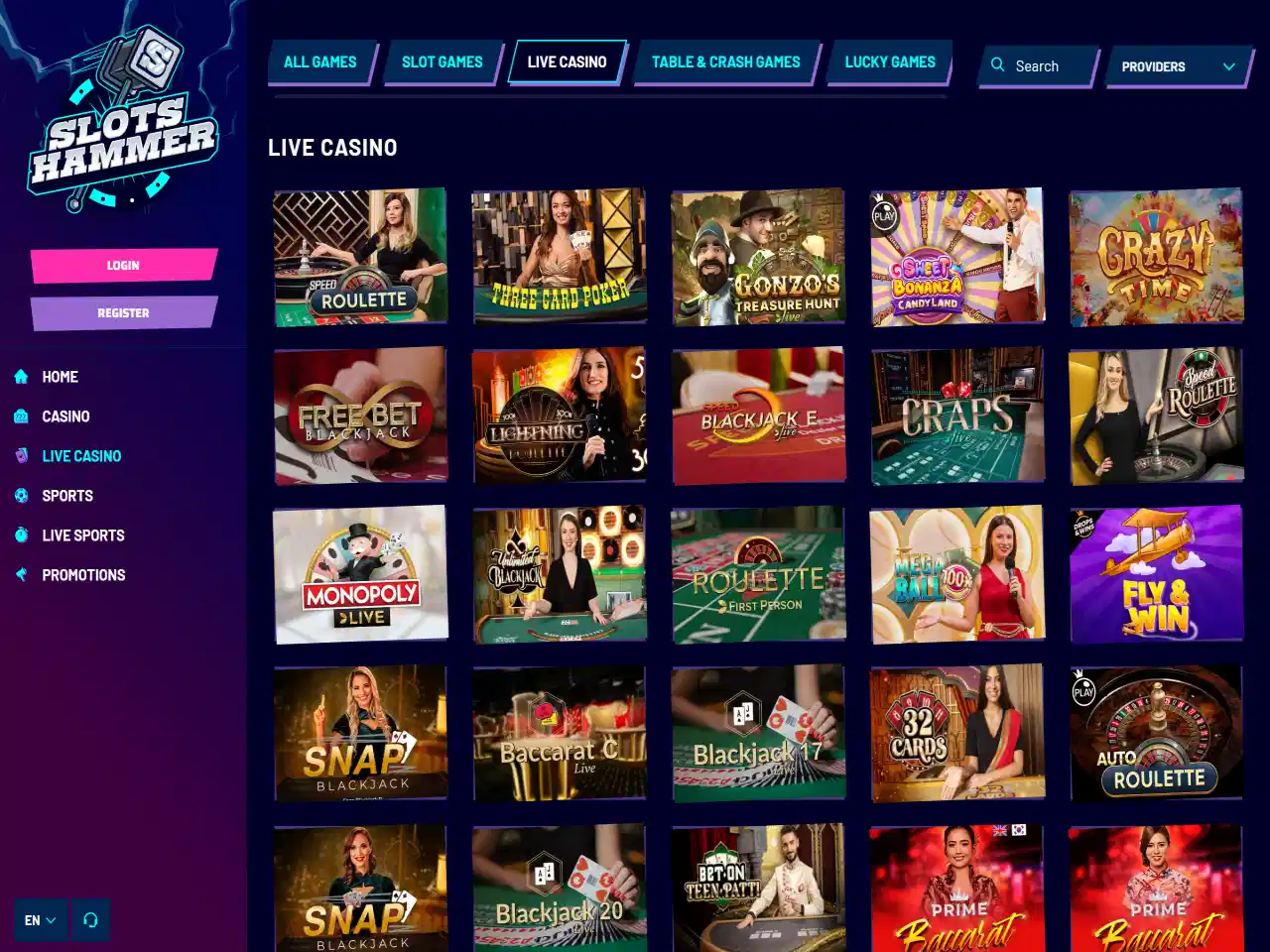 Slots Hammer Casino hosts a collection of more than 4,000 games, including 100+ live titles — a notably high count for a newly launched platform. Other games span across categories such as pokies, table & and crush titles. The Live Casino section includes roulette, blackjack, baccarat, craps, poker, game shows, and interesting titles like Three Card Poker, Free Bet Blackjack, and Crazy Time. This casino offers a consistent and structured layout with available filters and a search function.